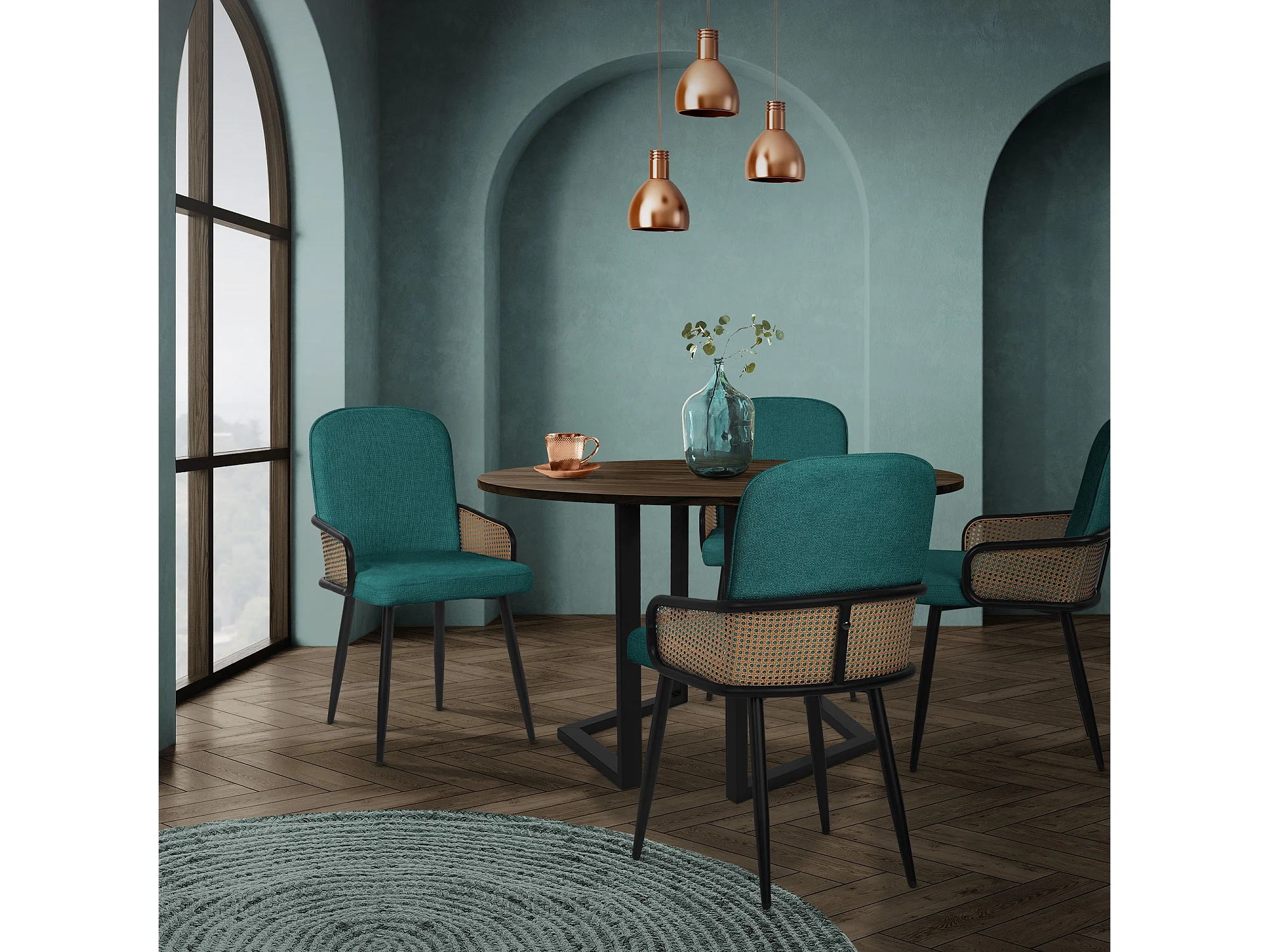 ML-Design Set 6 sedie imbottite da pranzo verde petrolio, in tessuto, con braccioli effetto rattan, sedia da cucina, sedia ergonomica da soggiorno
