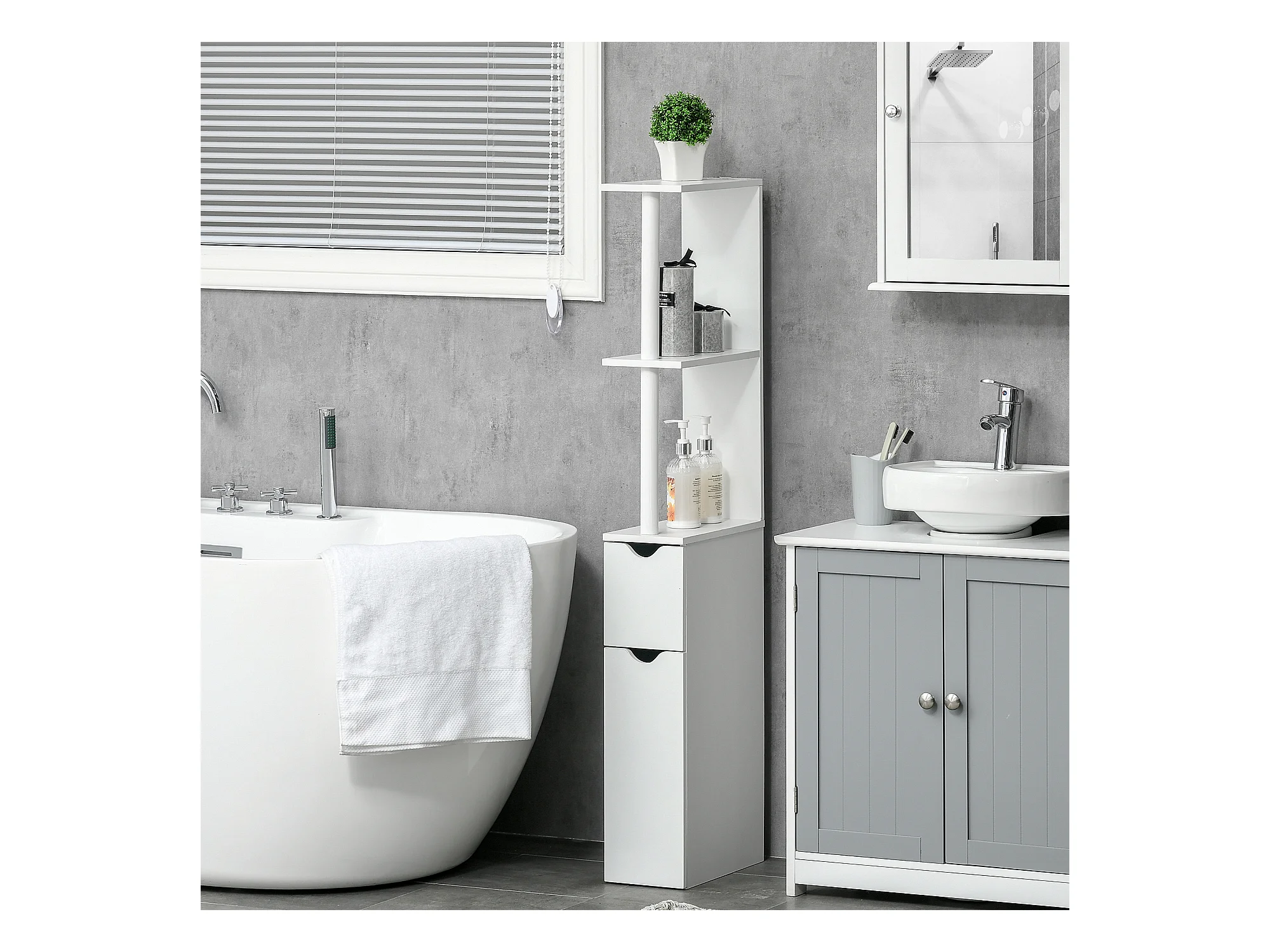 Colonna bagno con 2 armadietti, 3 ripiani aperti e cassetto bianco