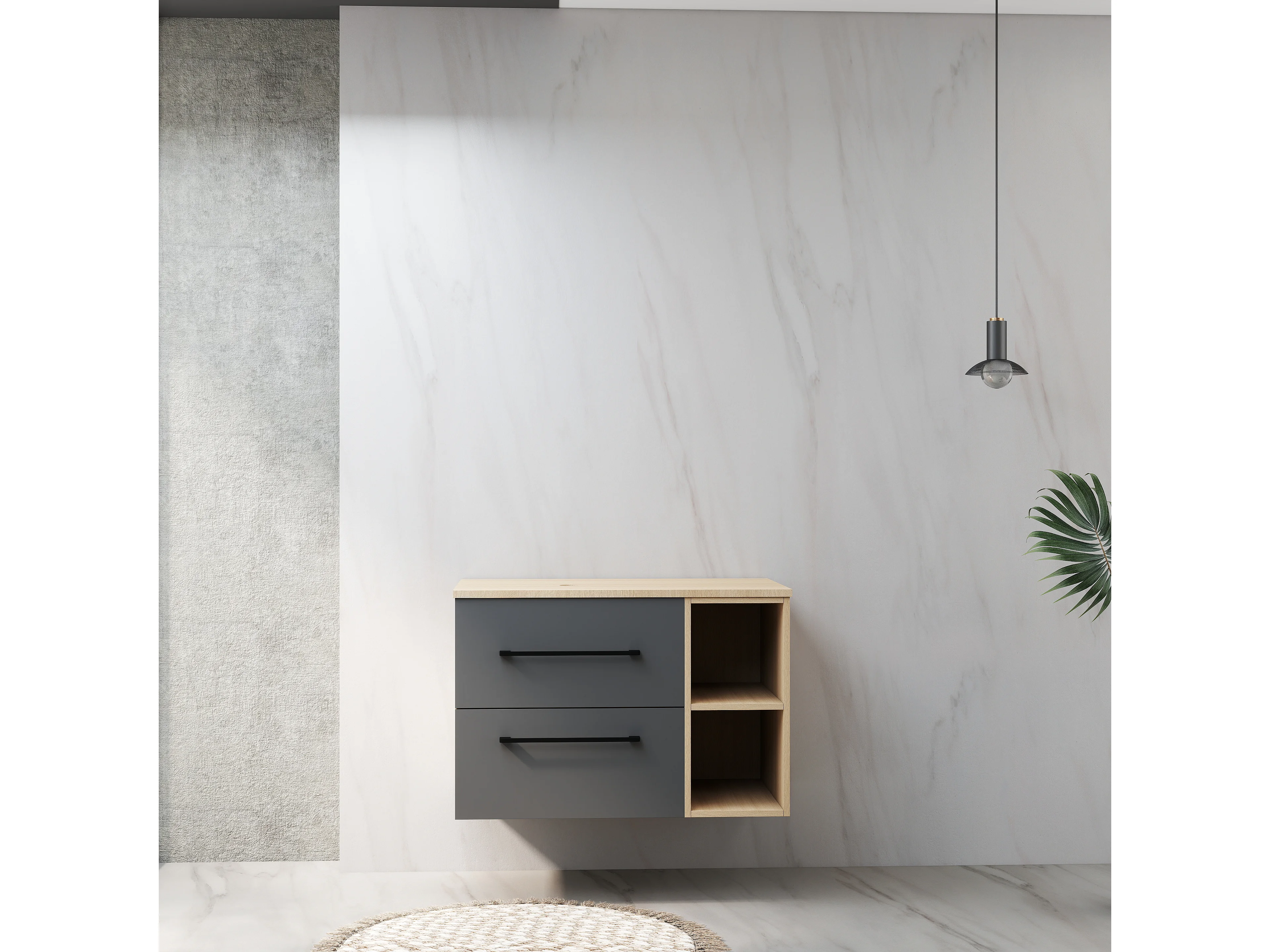 Mobile bagno a due cassetti 79cm senza lavabo, sospeso, finitura rovere, con ripiani aperti