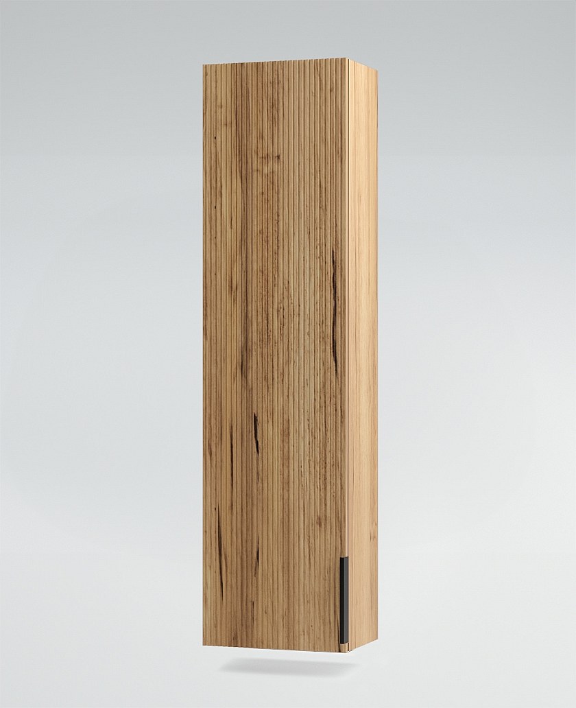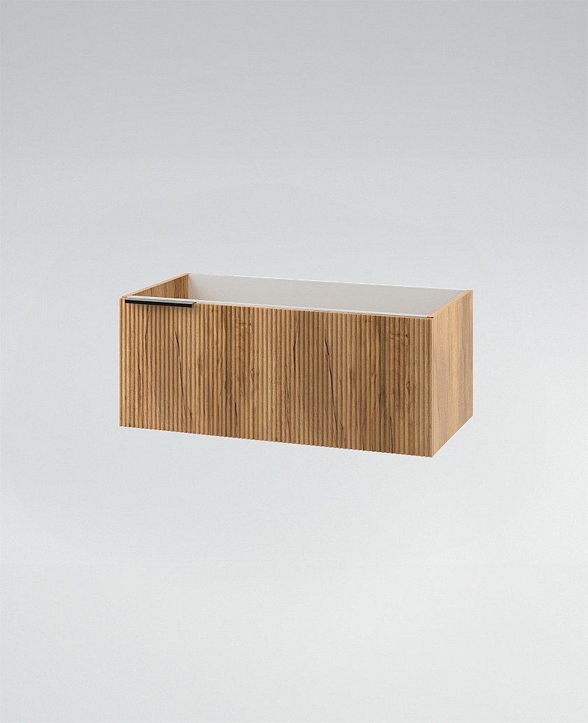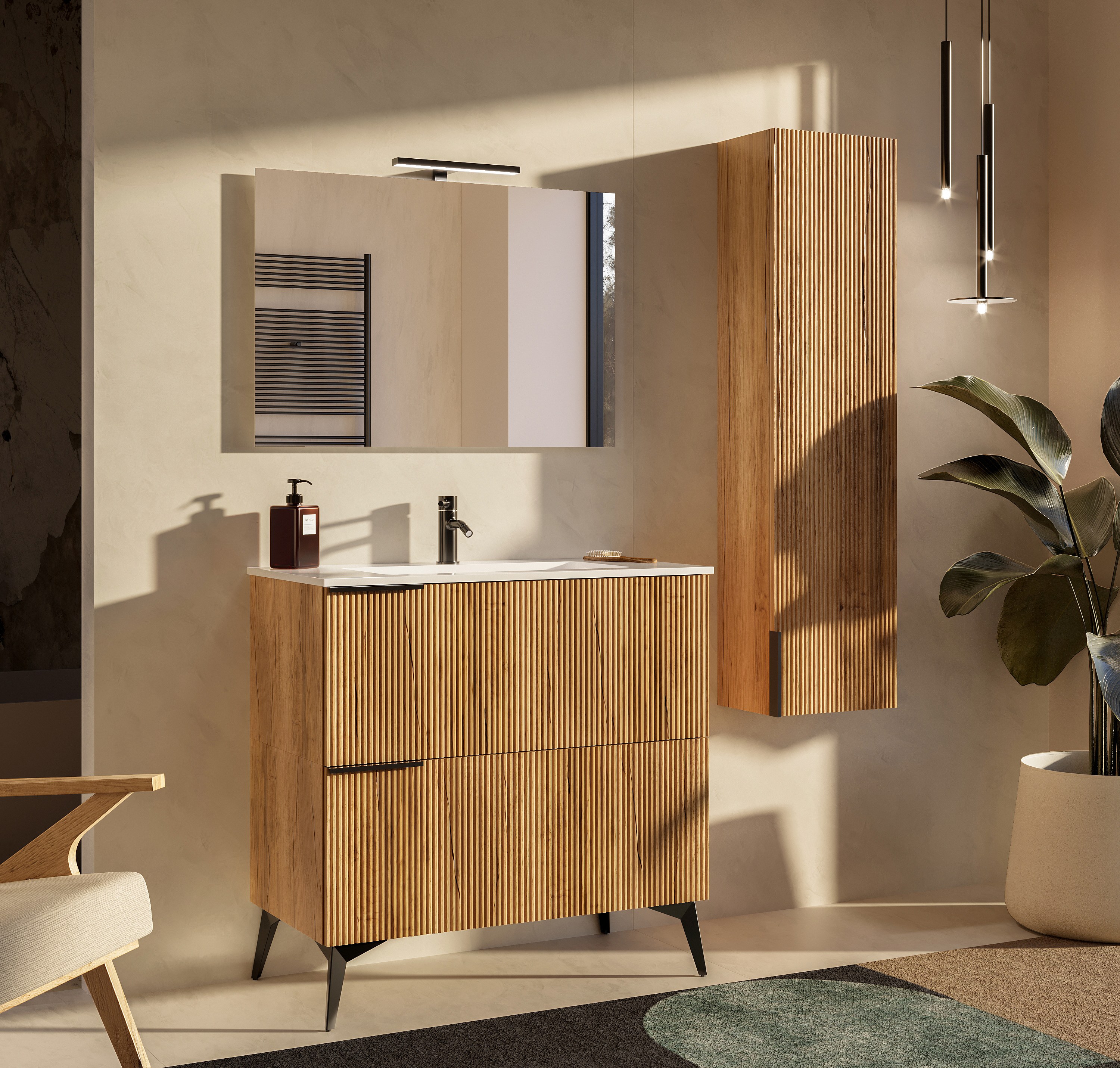 Mobile bagno sospeso striato con lavabo da incasso e colonna con nicchia - 2 cassetti - Naturale chiaro - 80 cm - SARONE