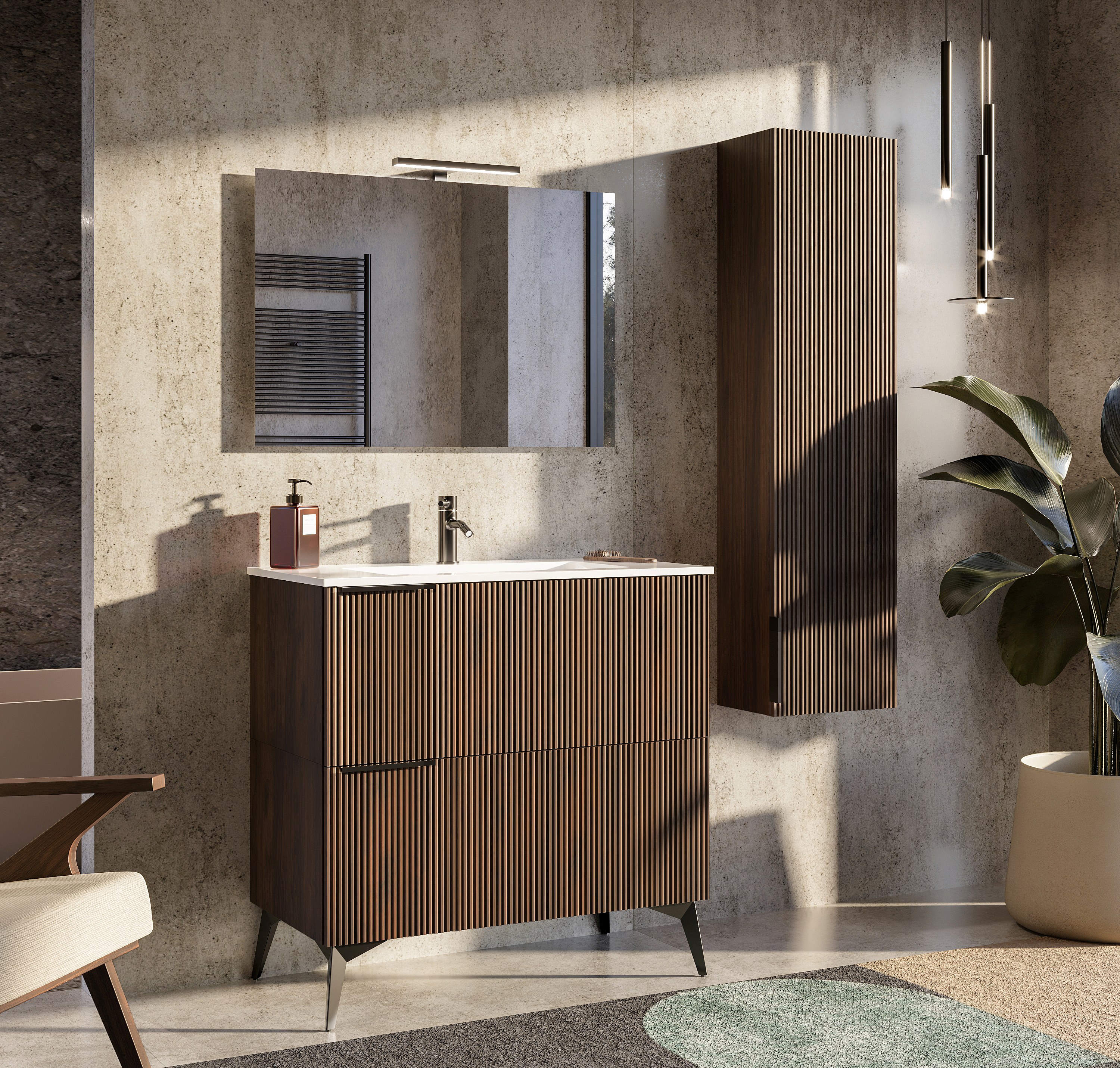 Mobile bagno con lavabo integrato L 90 x H 35,5x P 46 Noce Nordico Scuro Cassettiera Colonna c/Piedini e Specchio
