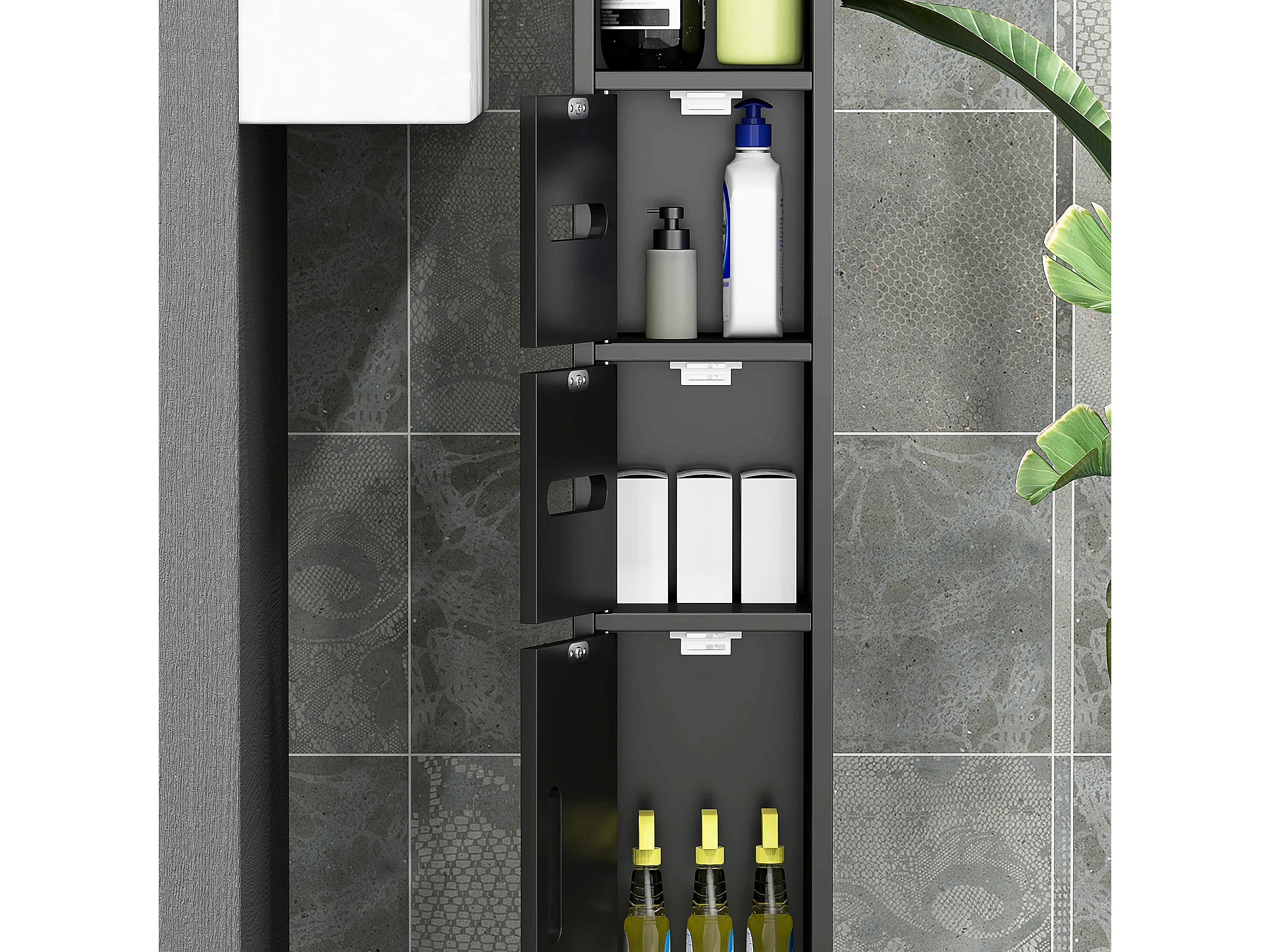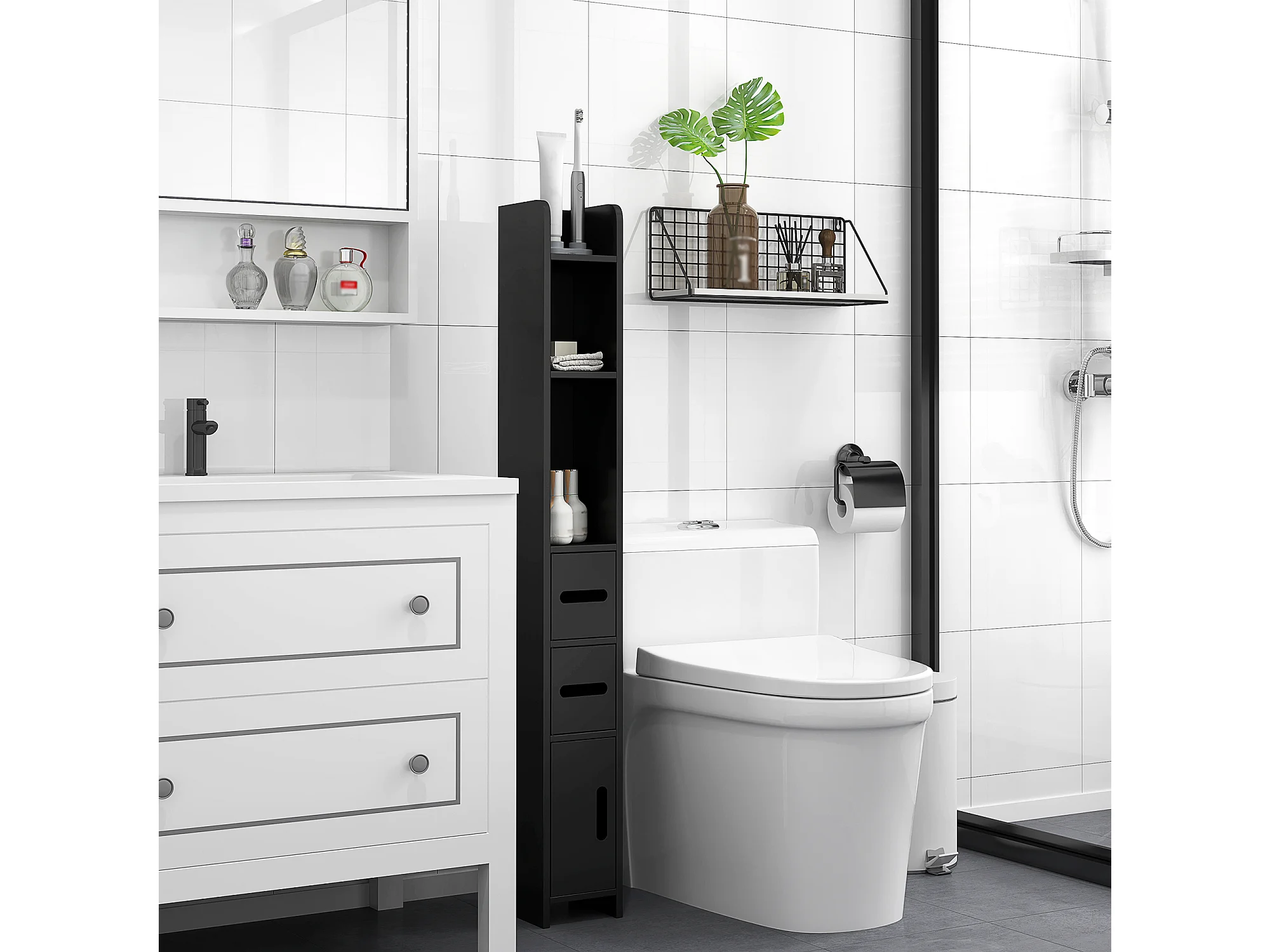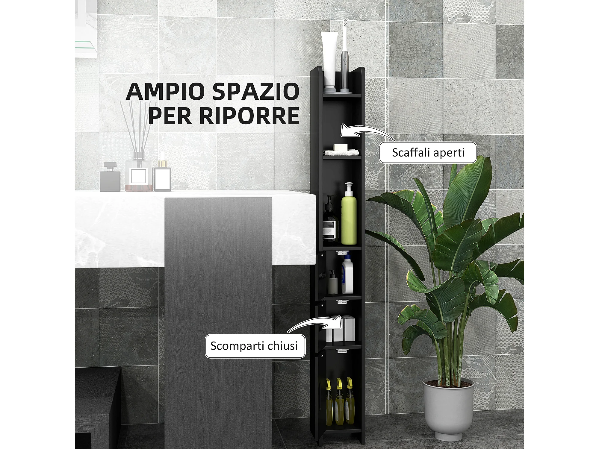 Mobile colonna bagno con 2 armadietti e 2 ripiani in legno nero