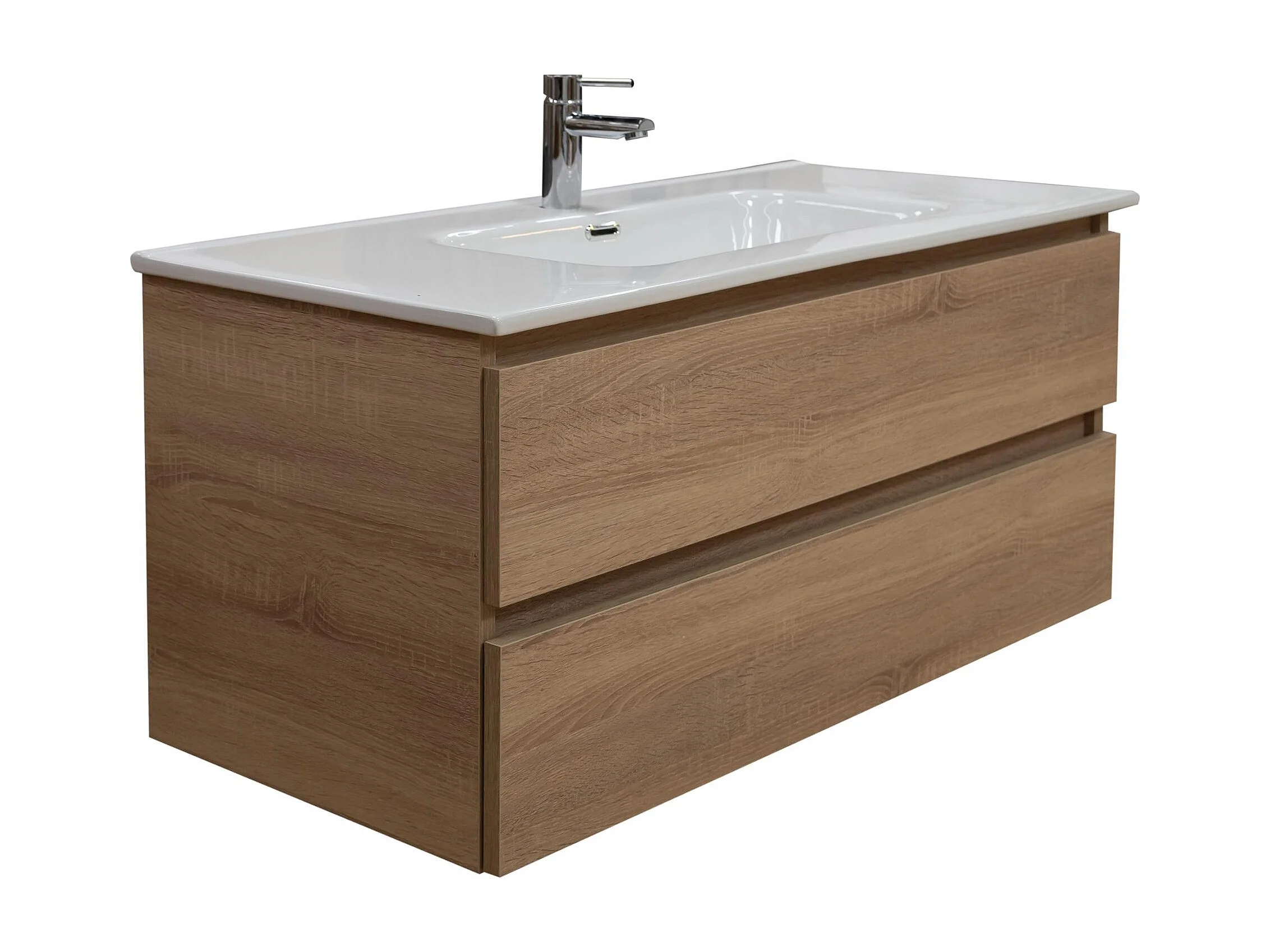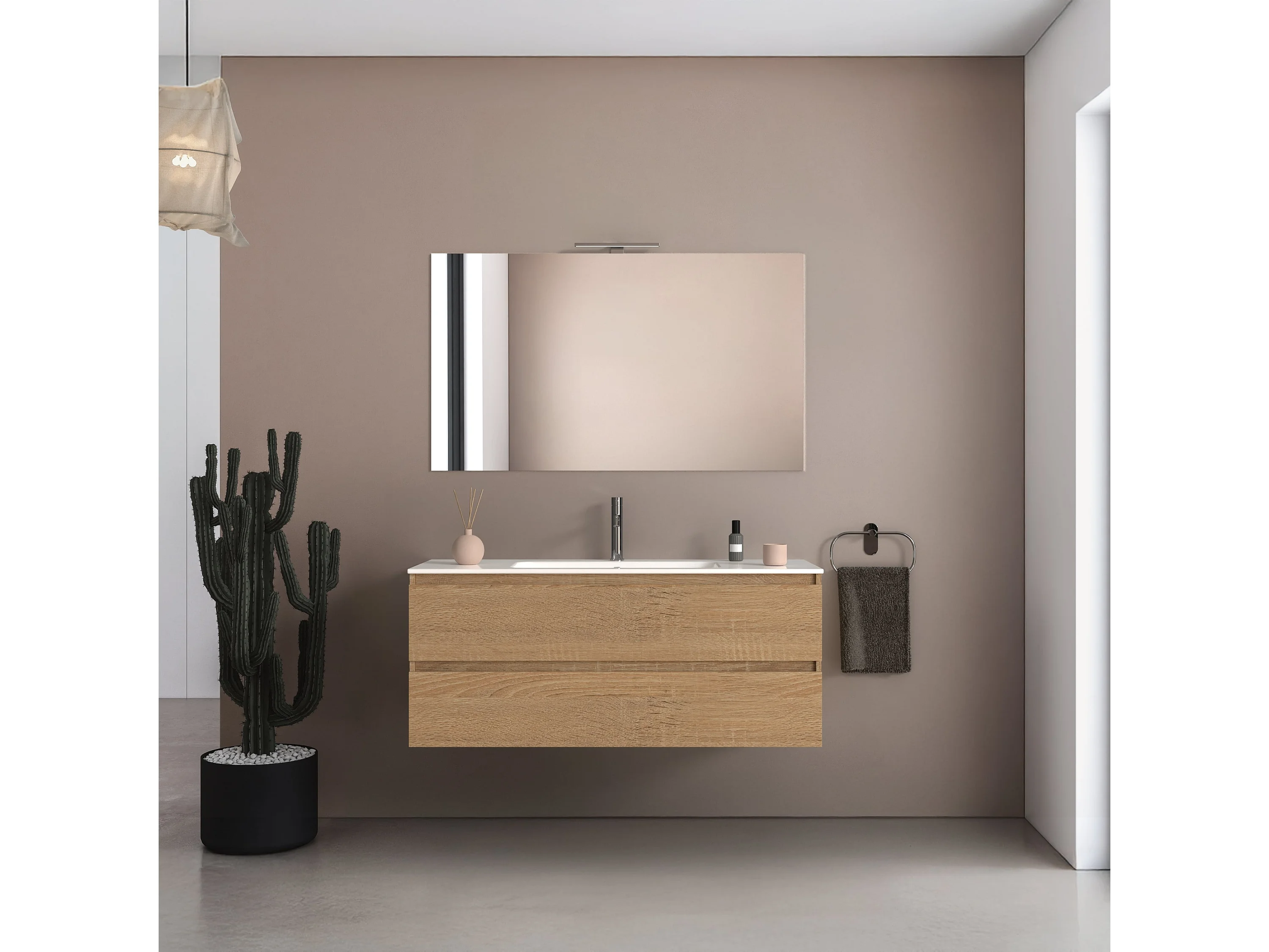 Mobile bagno sospeso 120 cm in legno color rovere americano con lavabo, specchio e faretto a led I Made in Italy