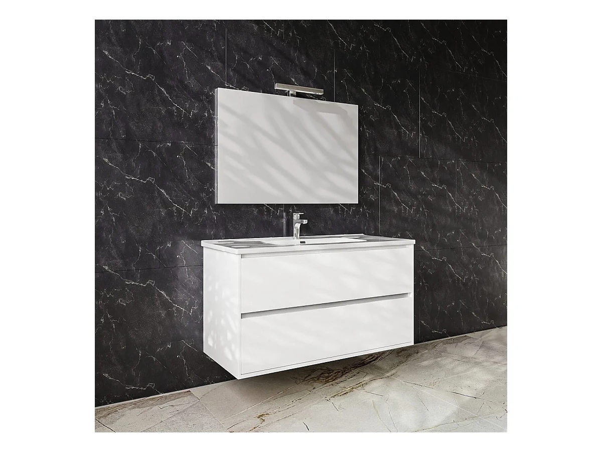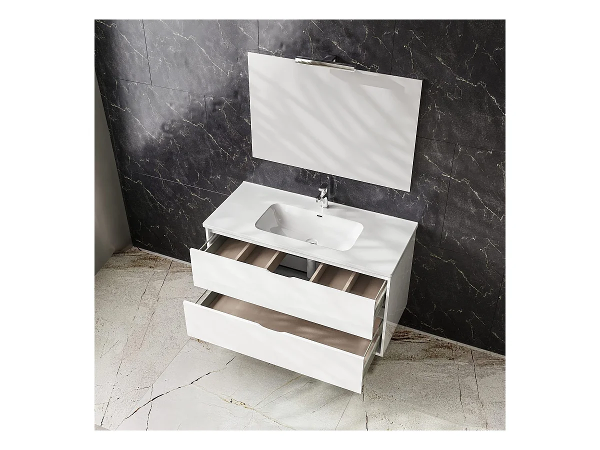 Mobile bagno sospeso da 75 cm bianco lucido con due cassetti Glass, lavabo in ceramica, specchio e luce