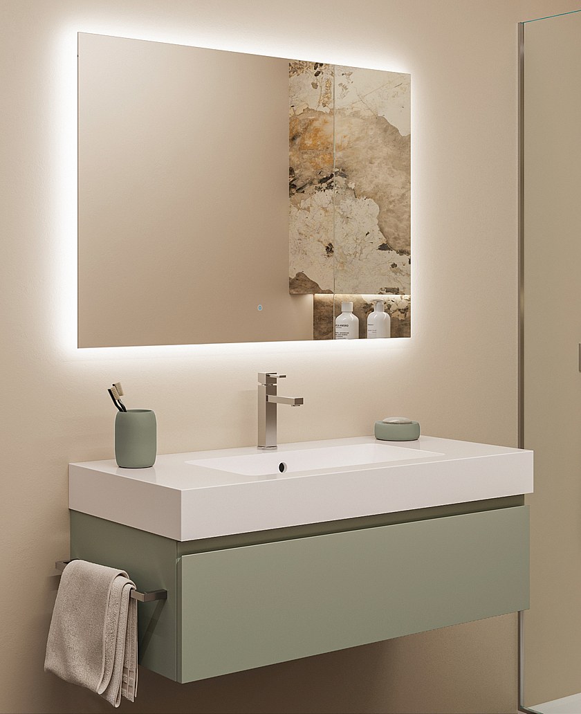 Mobile bagno sottolavabo con lavabo ad incasso L 100 x H 28 x P 46 specchio illuminato e porta asciugamano verde salvia