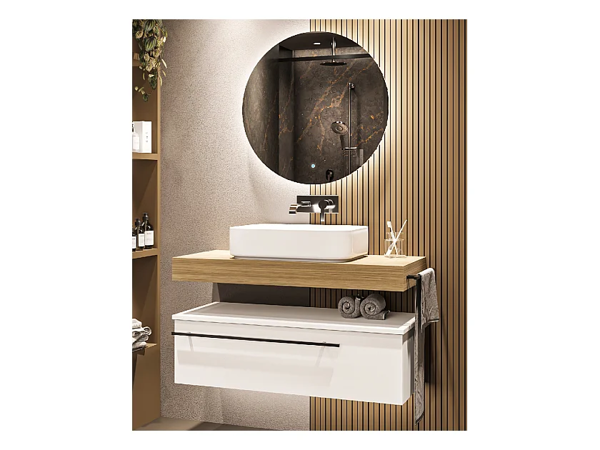 Mobile bagno Top L 100 x P 46 con lavabo in appoggio poro noce cassettiera bianco luce specchio illuminato e p.asciugamano