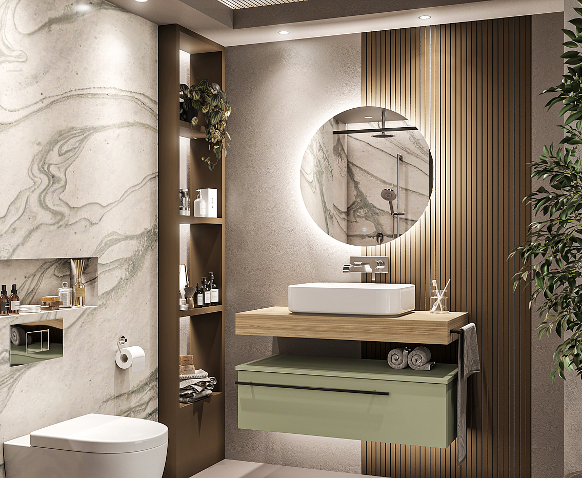 Mobile bagno Top L 100 x P 46 con lavabo in appoggio poro noce cassettiera verde salvia specchio illuminato e p.asciugamano