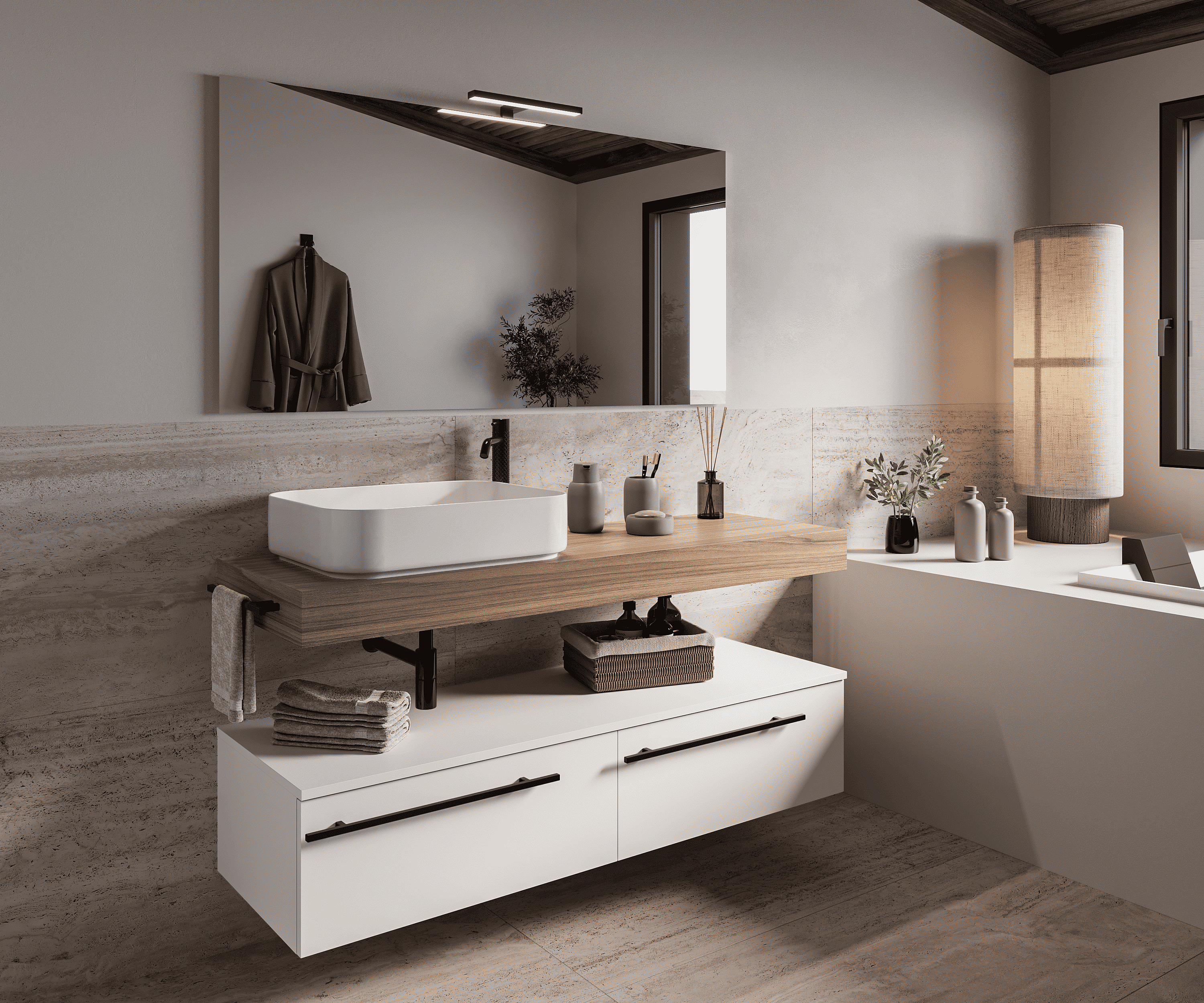 Mobile bagno Top L 140 x P 46 con lavabo in appoggio poro noce cassettiera 140 bianco luce specchio rettangolare