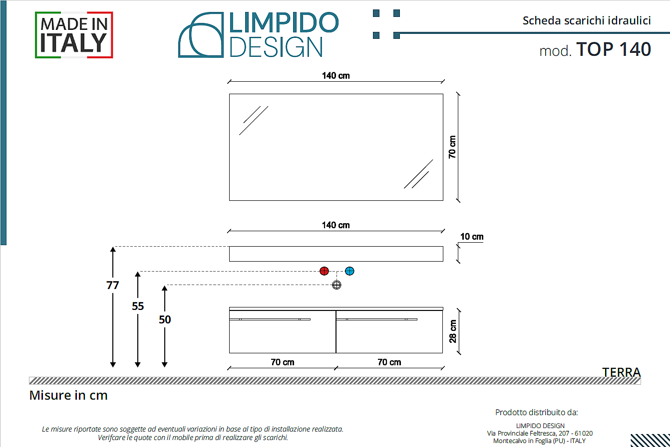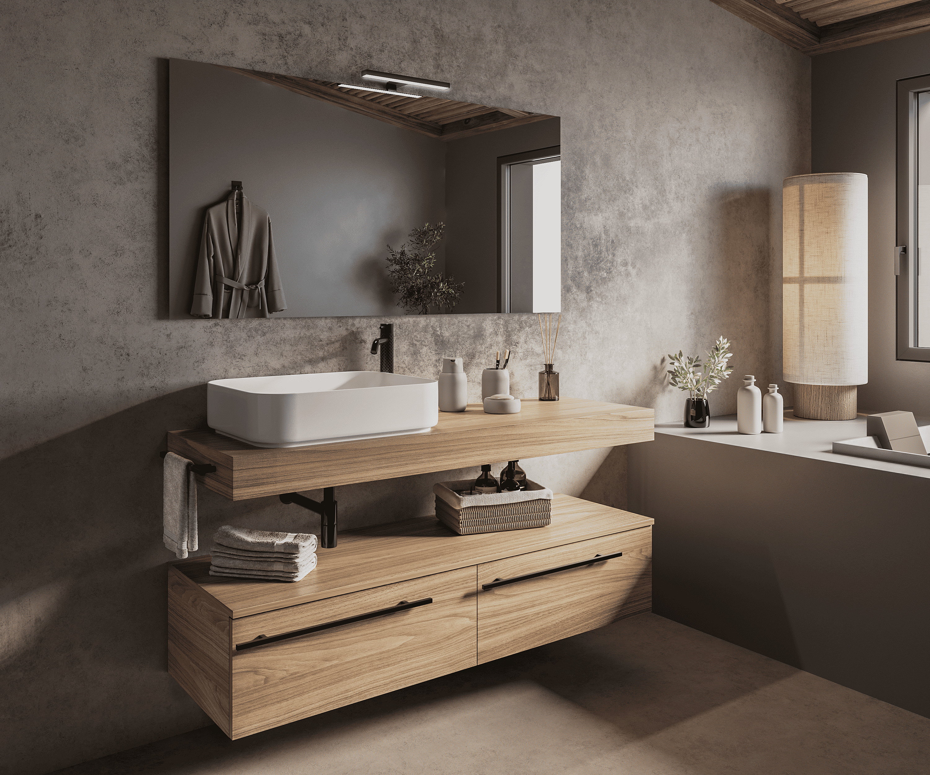 Mobile bagno Top L 140 x P 46 con lavabo in appoggio poro noce cassettiera 140 poro noce specchio rettangolare