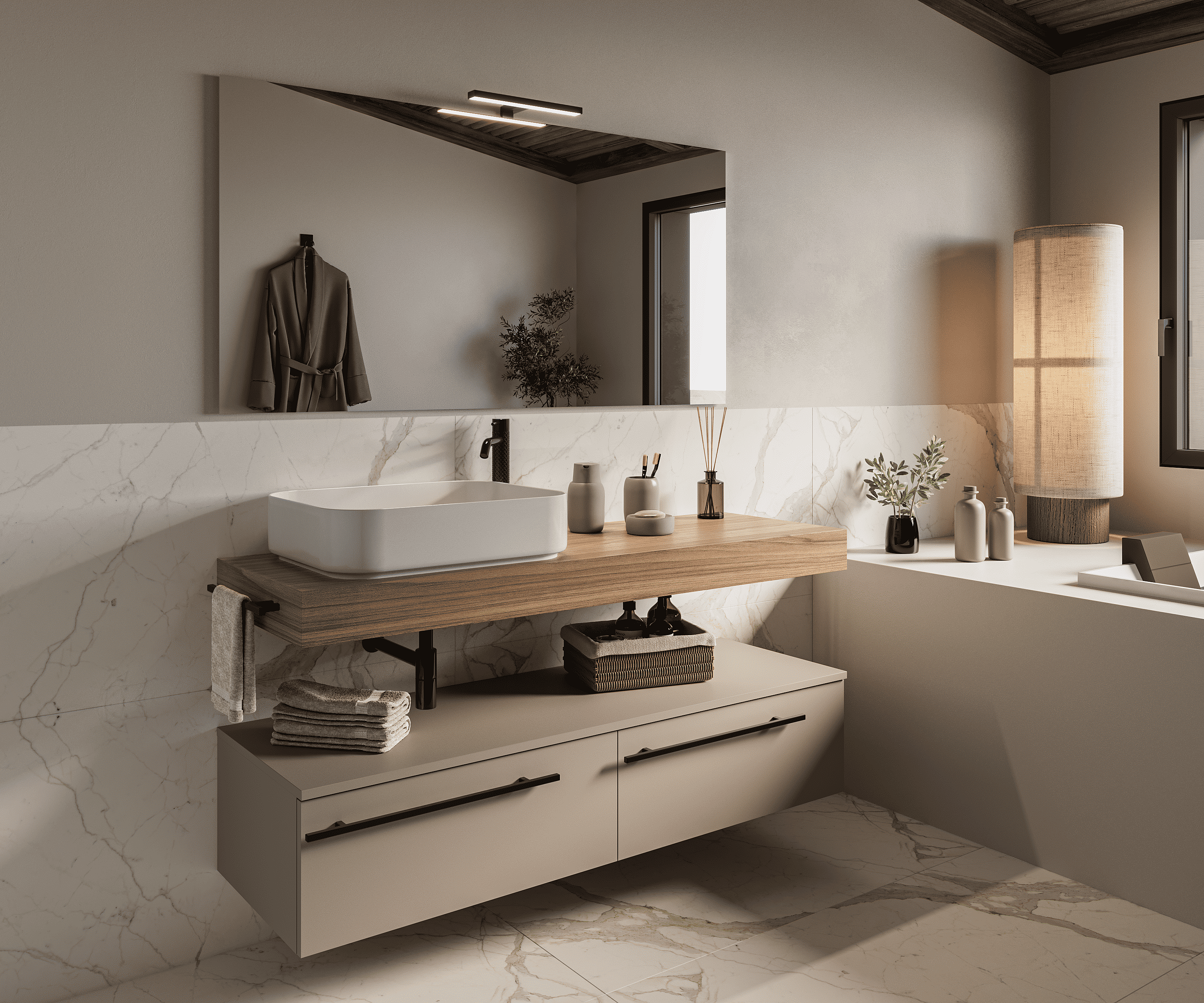 Mobile bagno Top L 140 x P 46 con lavabo in appoggio poro noce cassettiera 140 tortora milano specchio rettangolare