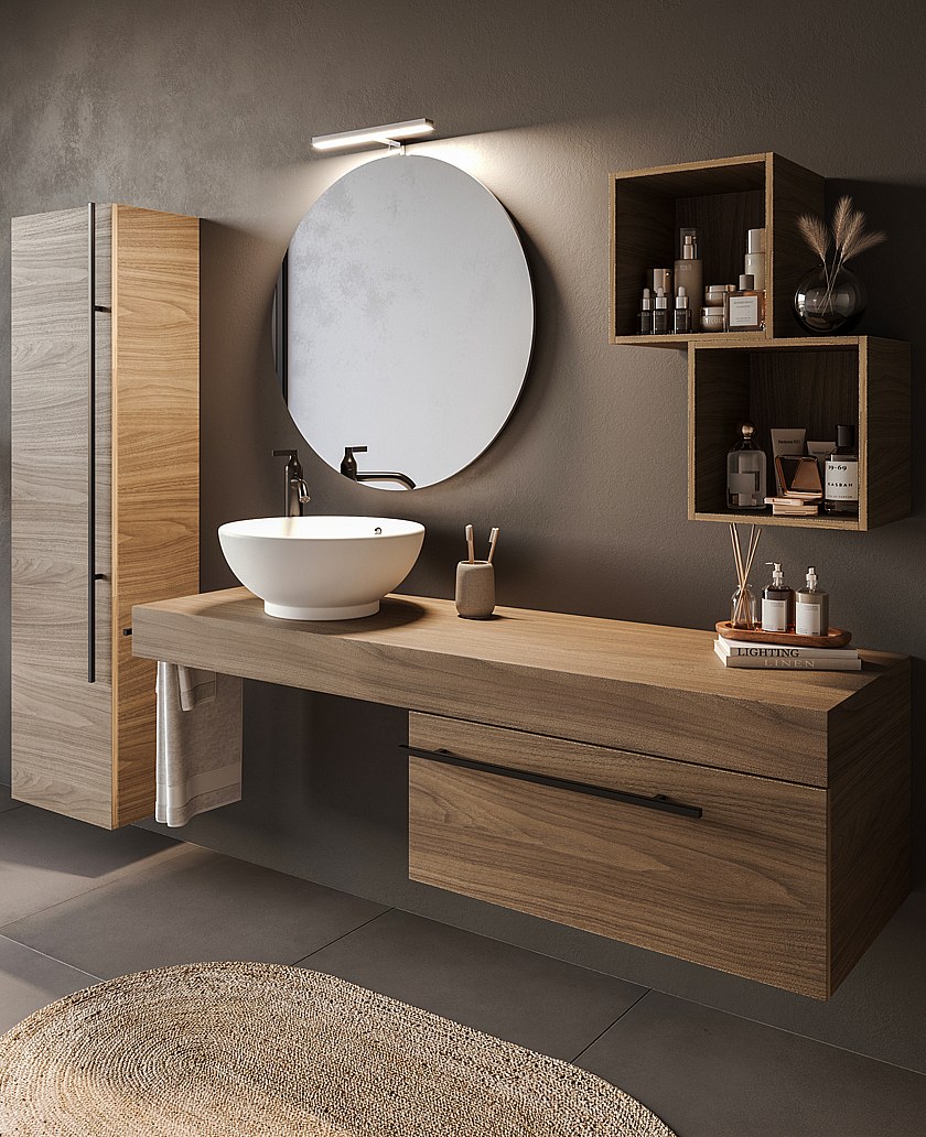 Mobile bagno Top L 140 x P 46 con lavabo in appoggio poro noce cassettiera specchio rotondo