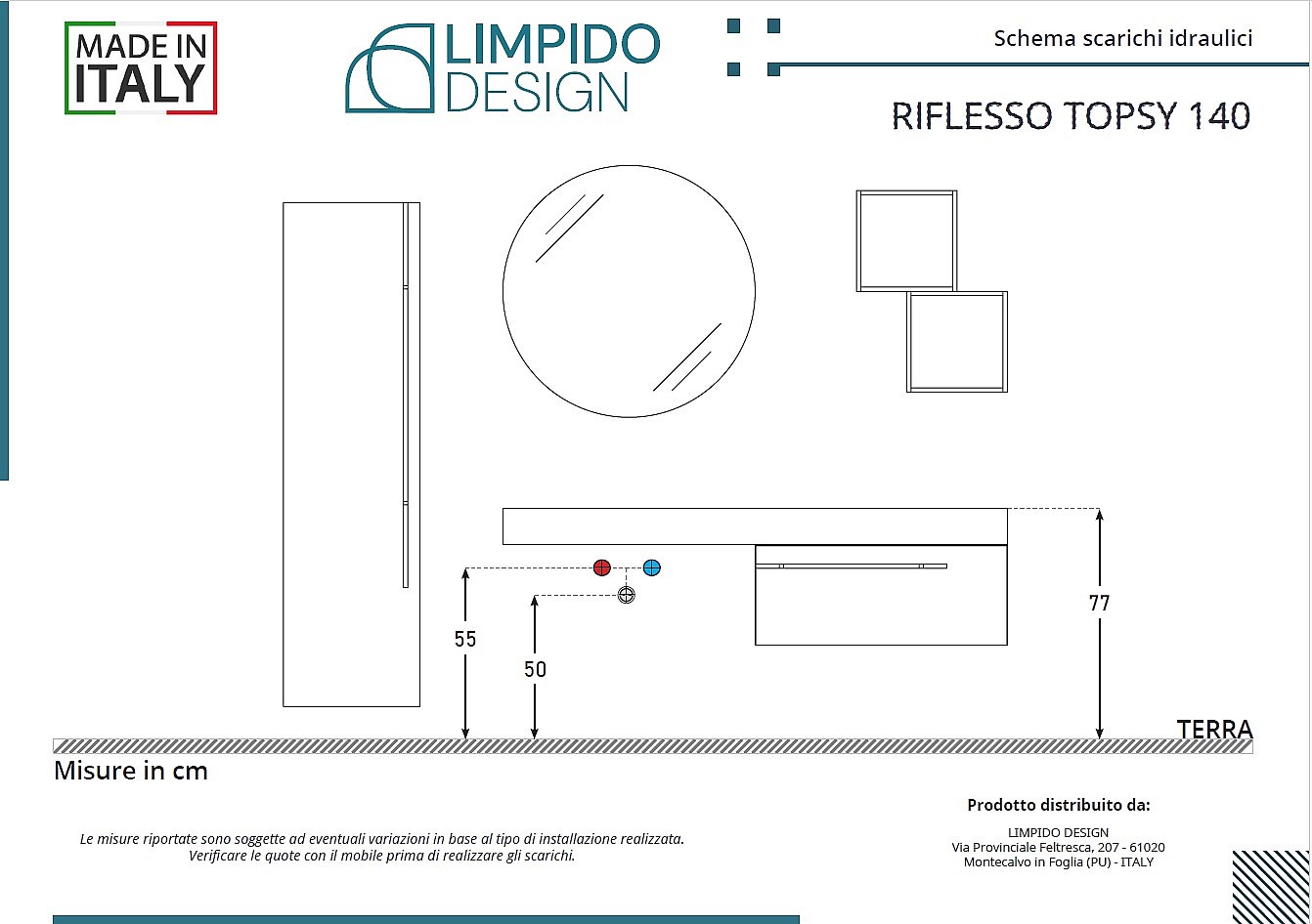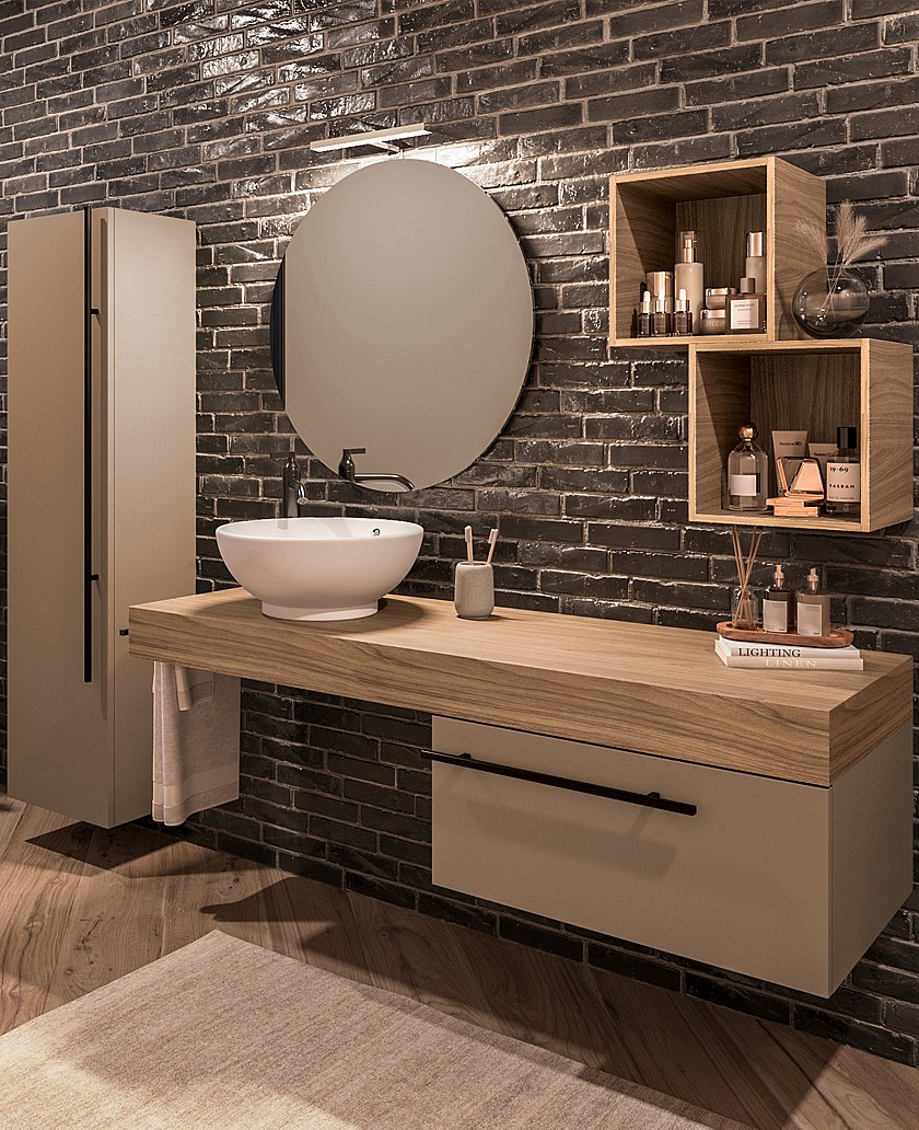 Mobile bagno Top L 140 x P 46 con lavabo in appoggio poro noce cassettiera tortora milano specchio rotondo