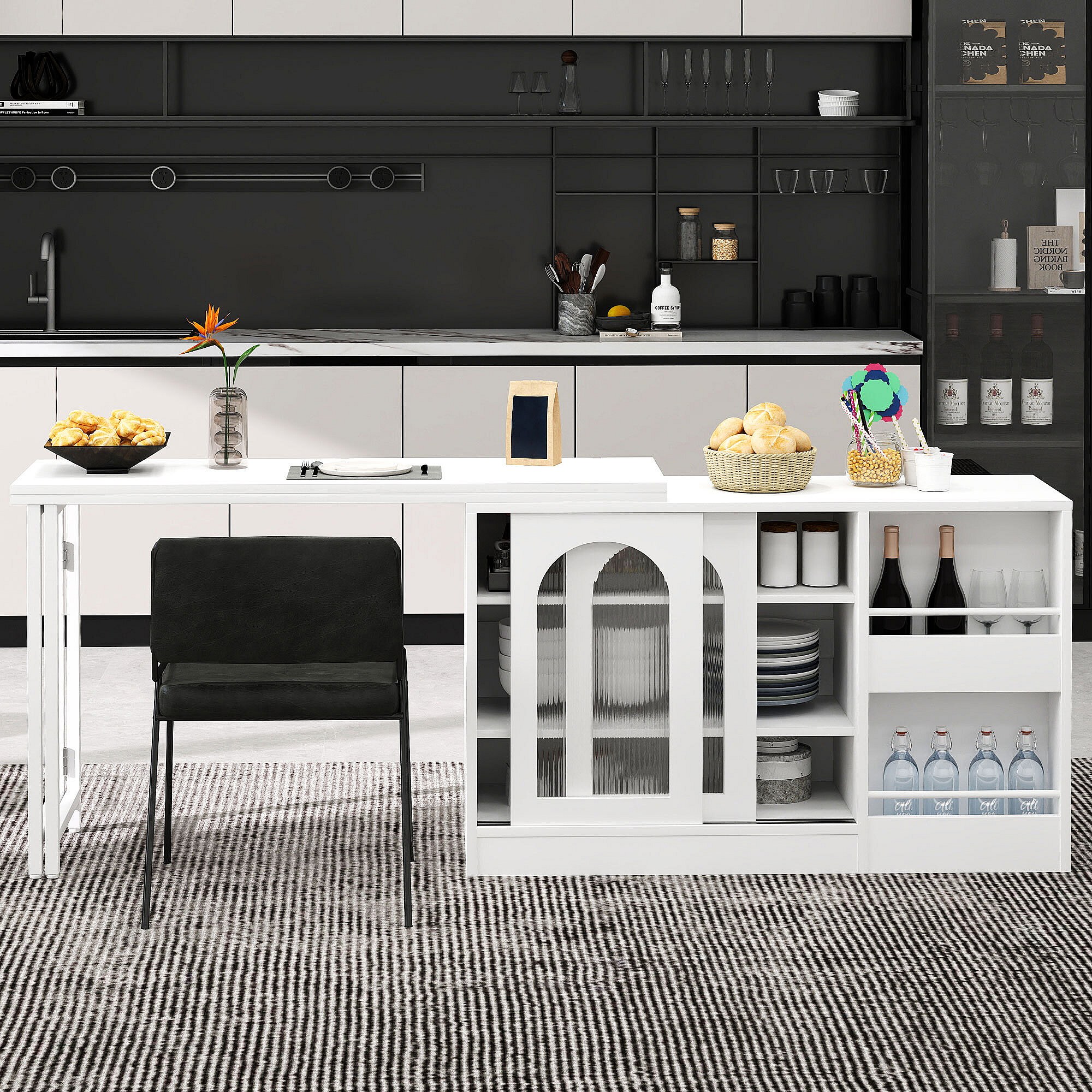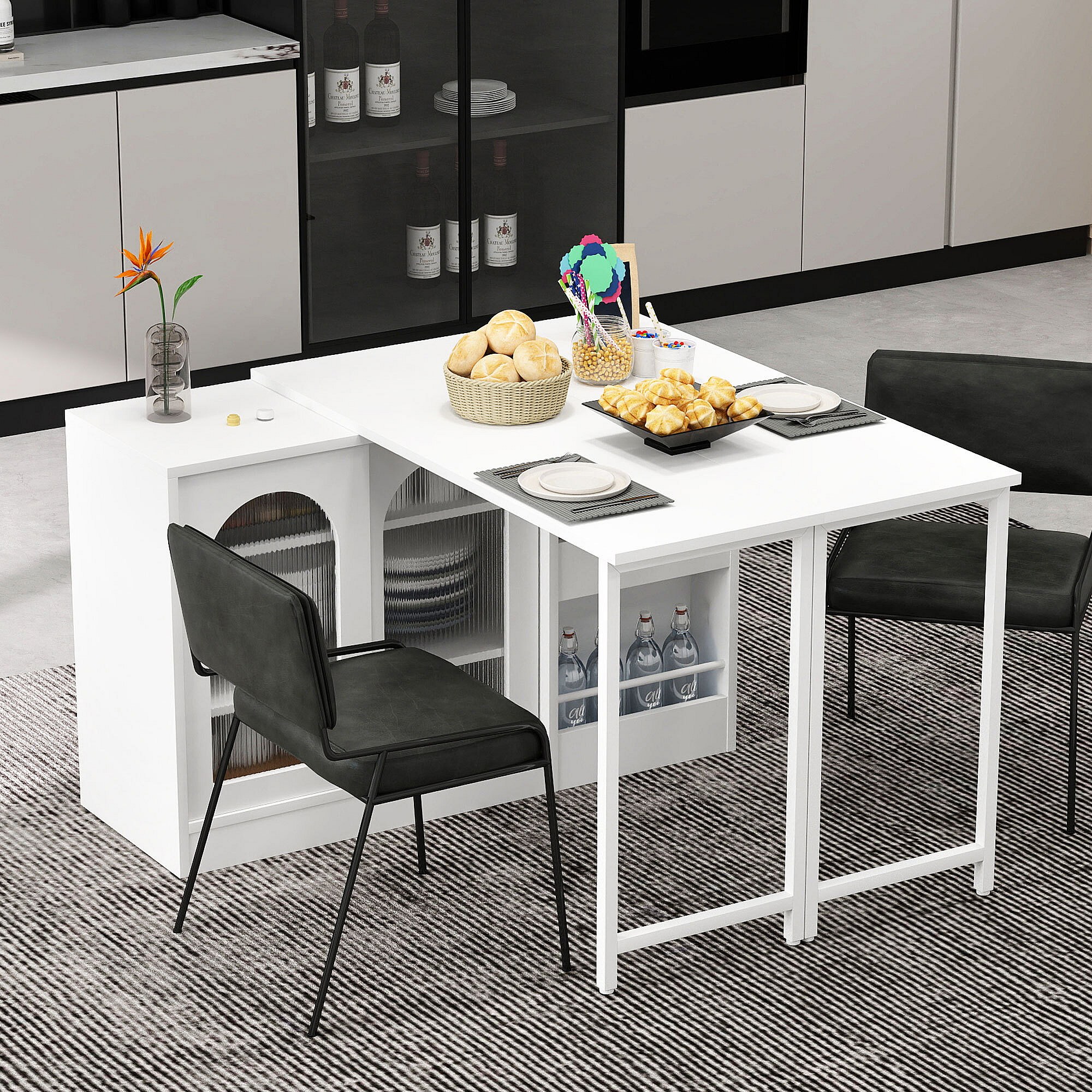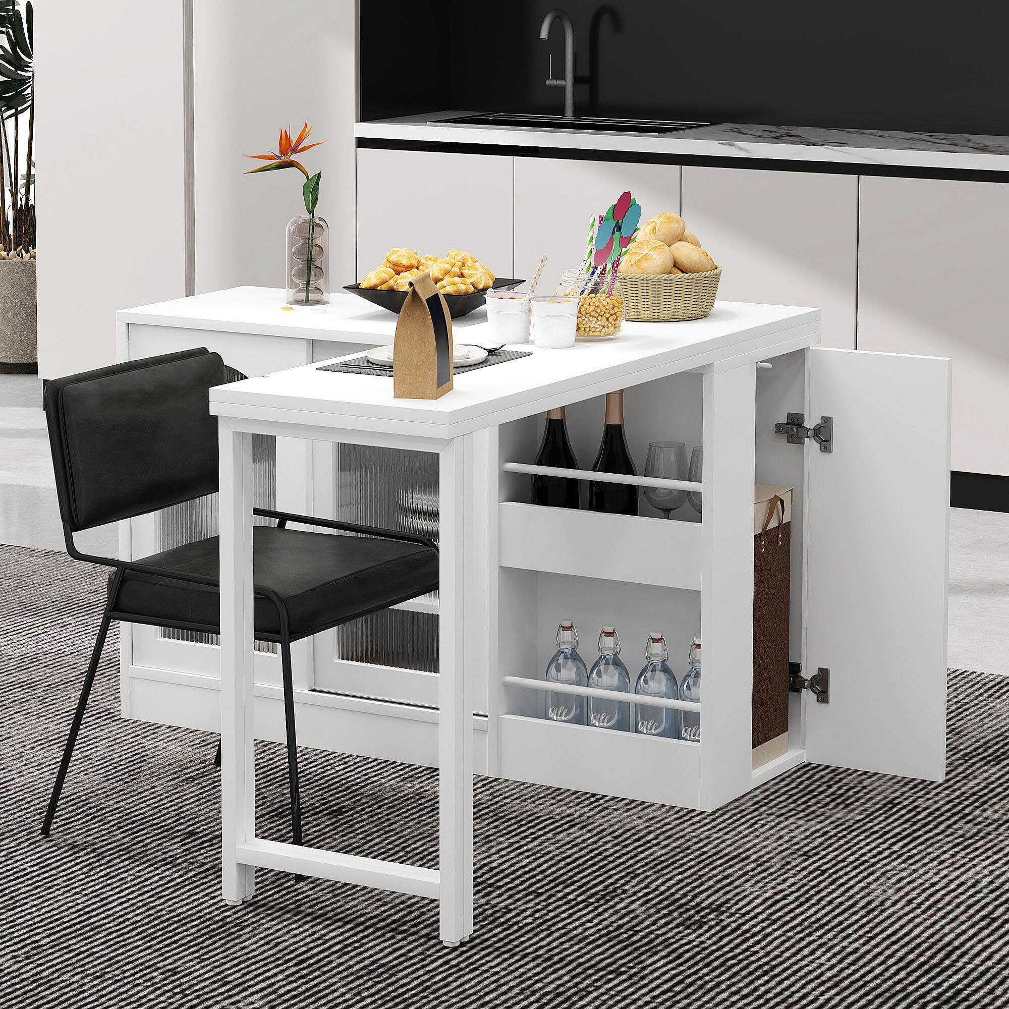 Mobile bar girevole - Tavolo bar estensibile con 2 cassetti e 1 anta in vetro - spazio aperto - bianco