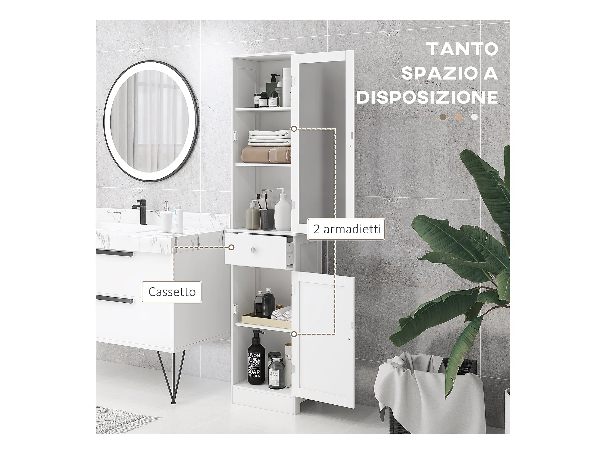 Colonna bagno moderna con 2 armadietti e ripiani regolabili bianco
