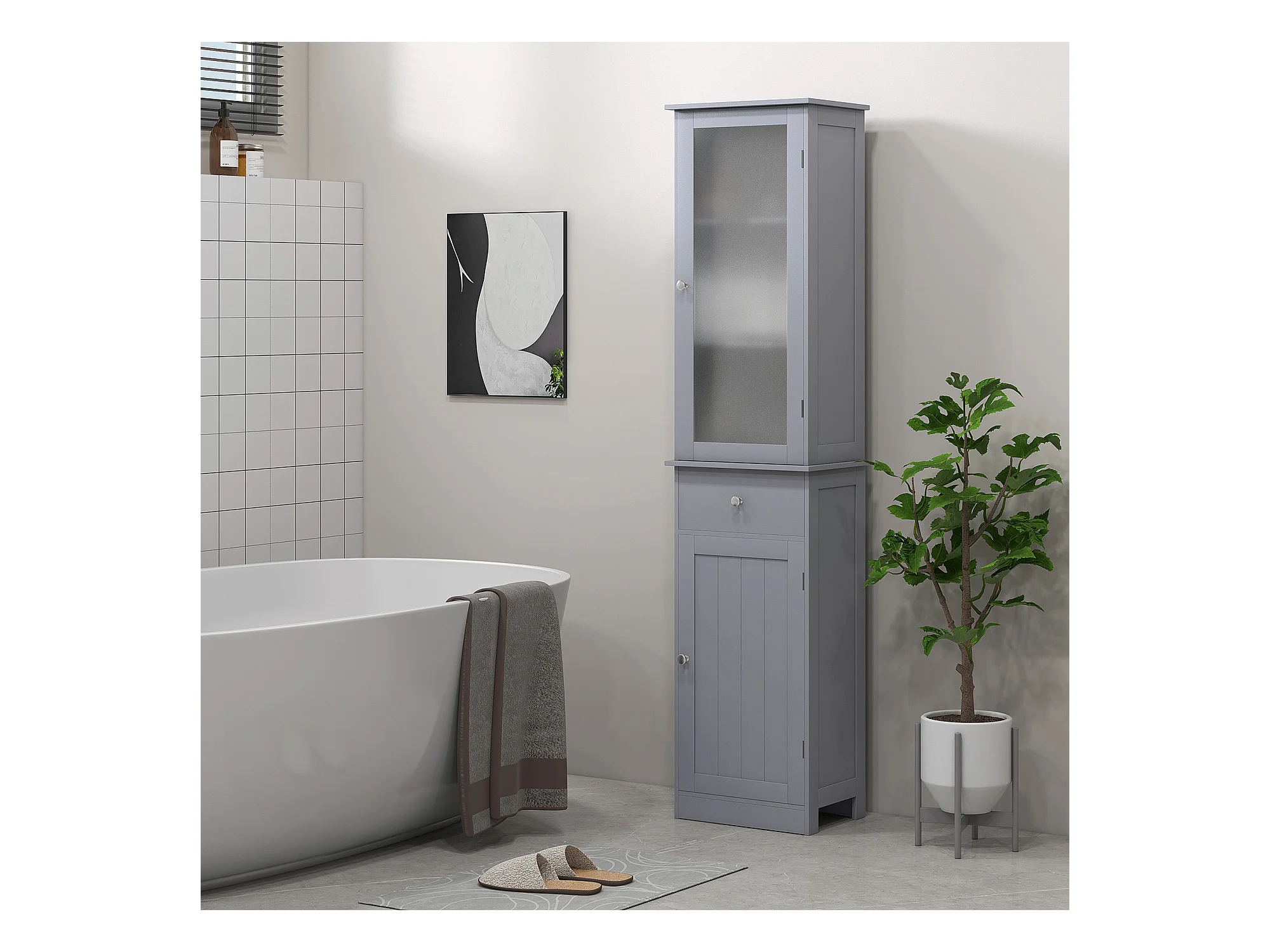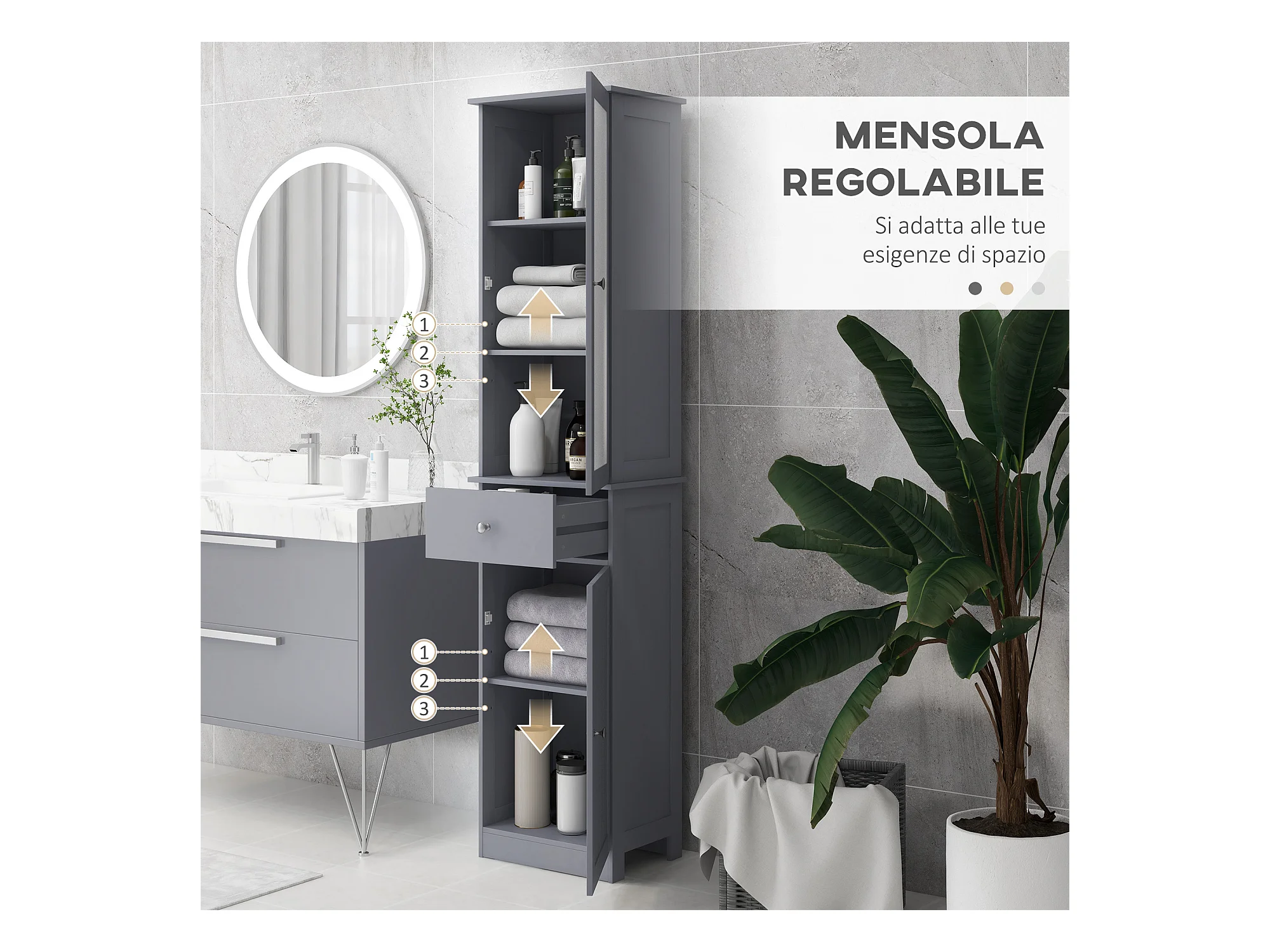 Colonna bagno con 2 ripiani e 2 armadietti bianco e grigio