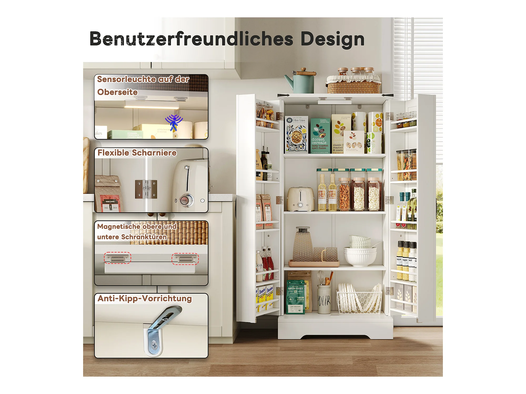 Credenza da cucina con 4 ante e scomparti - 100 x 47 x 187 cm - Legno MDF - LED e canaline per cavi - Bianco