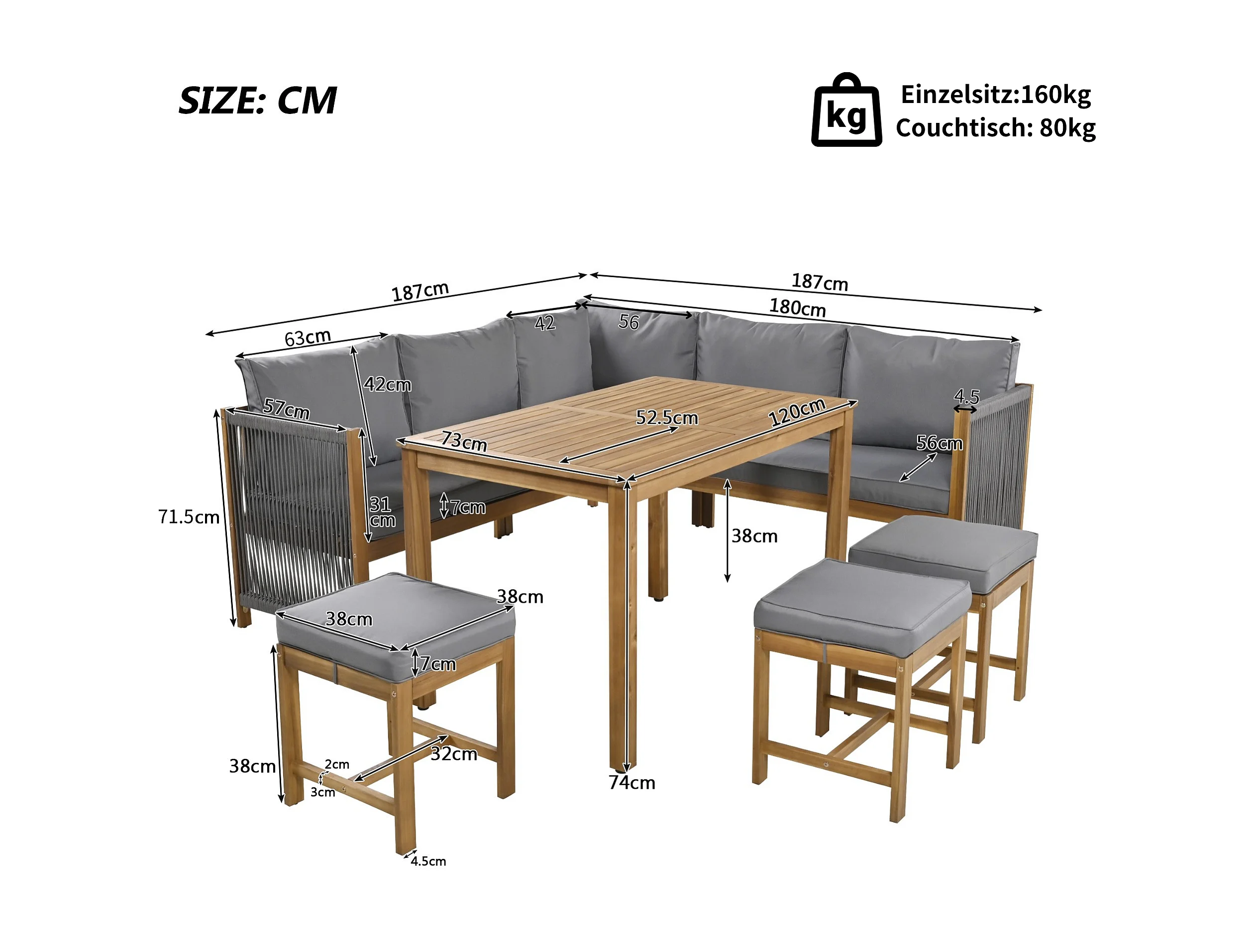Mobile da giardino per 7-8 persone - 2 divani, 3 sgabelli e 1 tavolo da pranzo - struttura in legno di acacia - Grigio