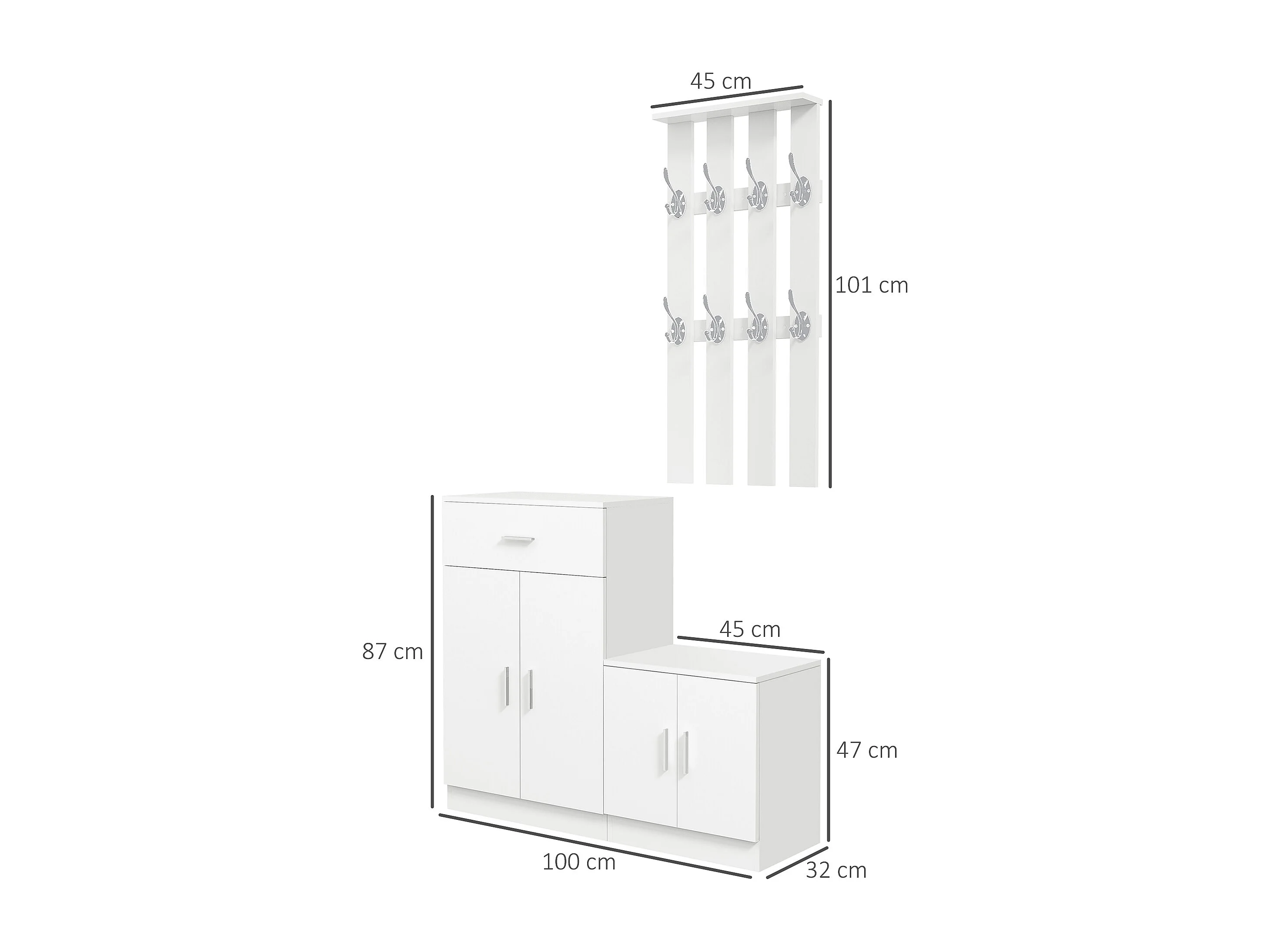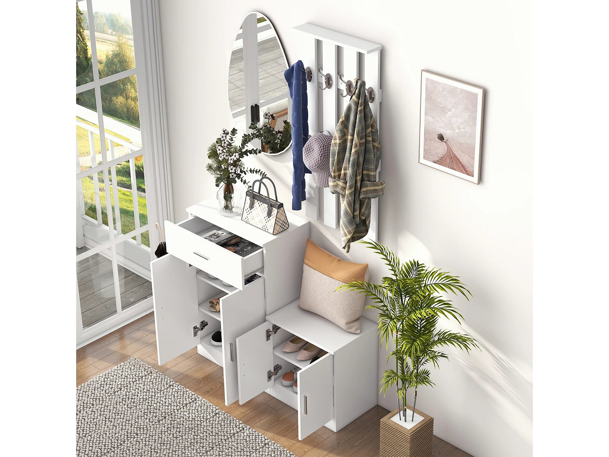 Set da ingresso con appendiabiti specchio panca e scarpiera bianco
