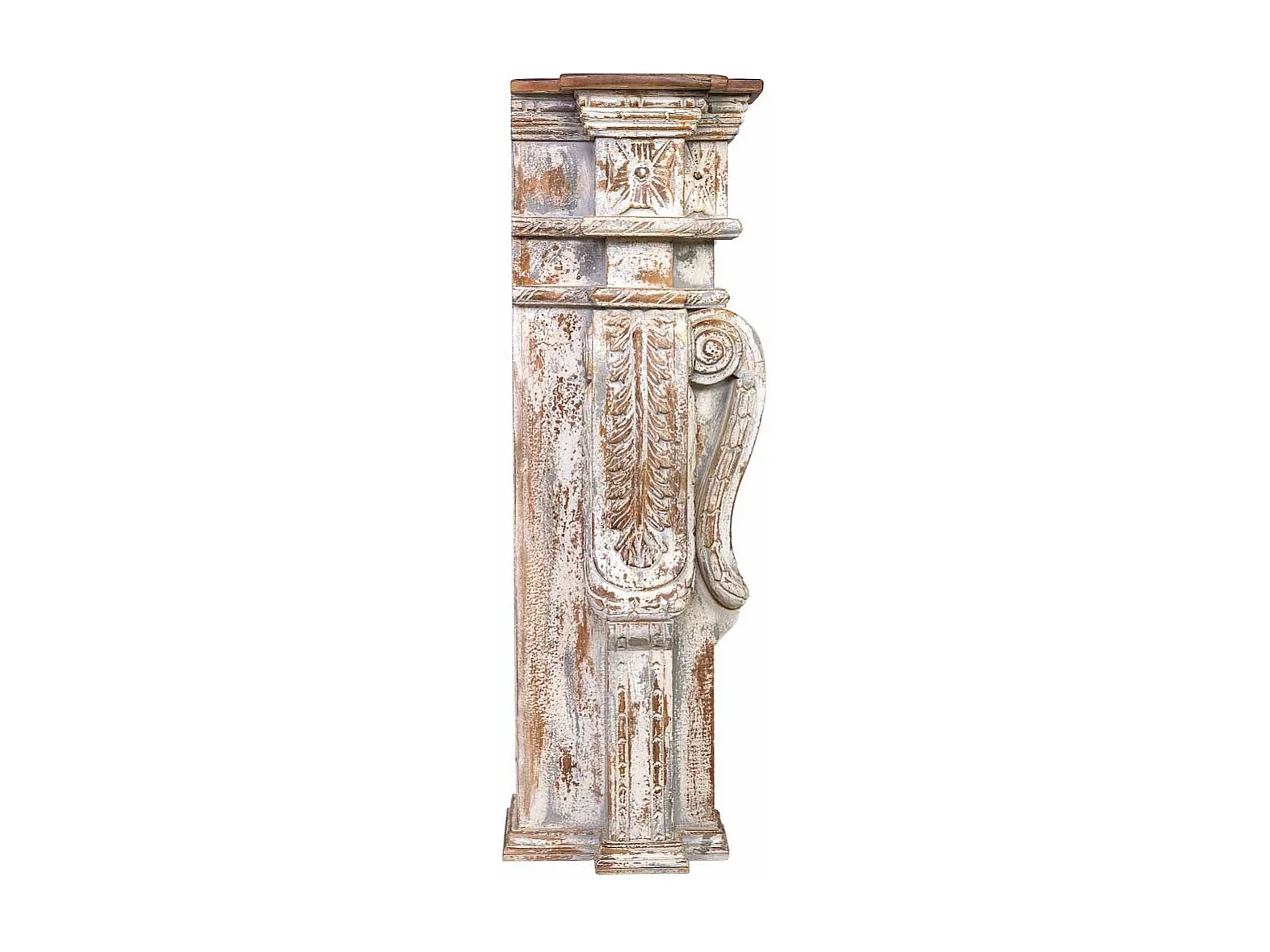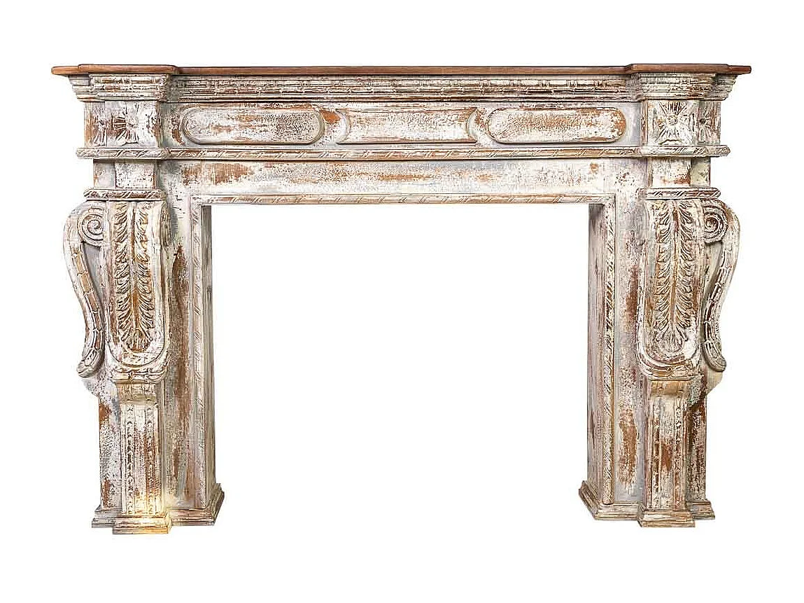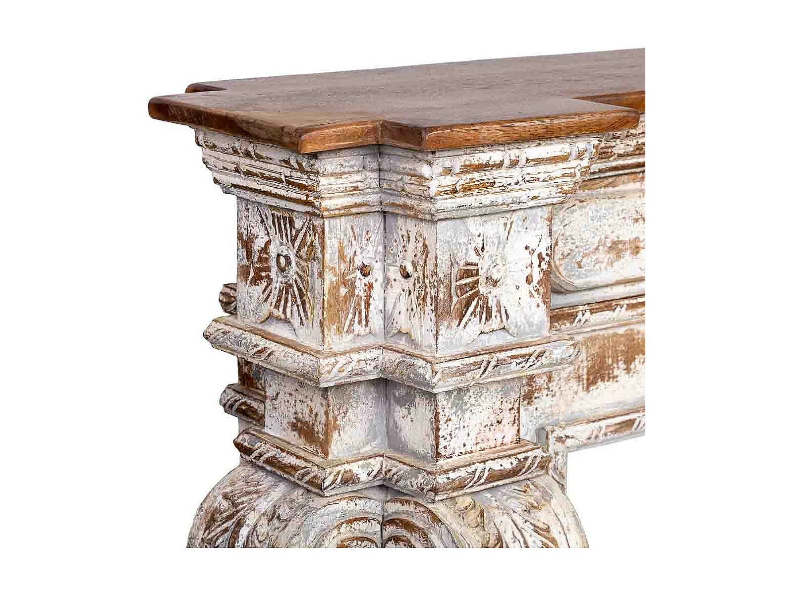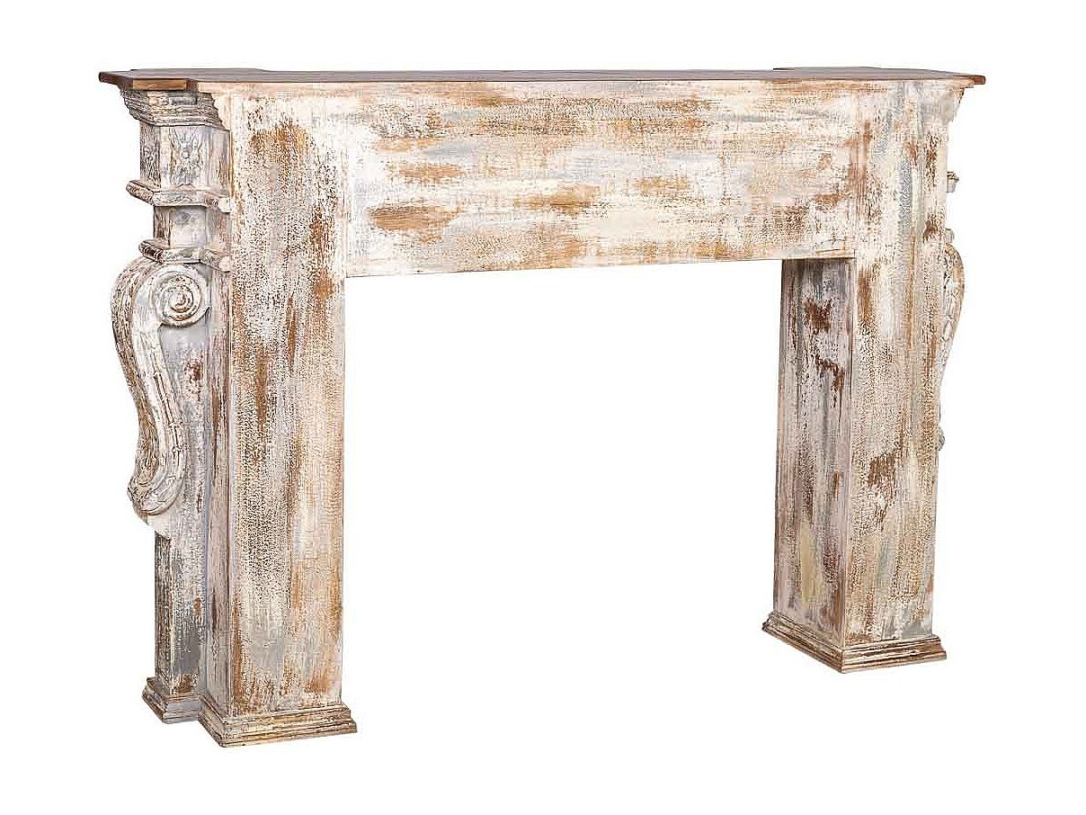Mobile da ingresso in legno intagliato con finitura bianco invecchiato lavorato a mano 149x33x98
