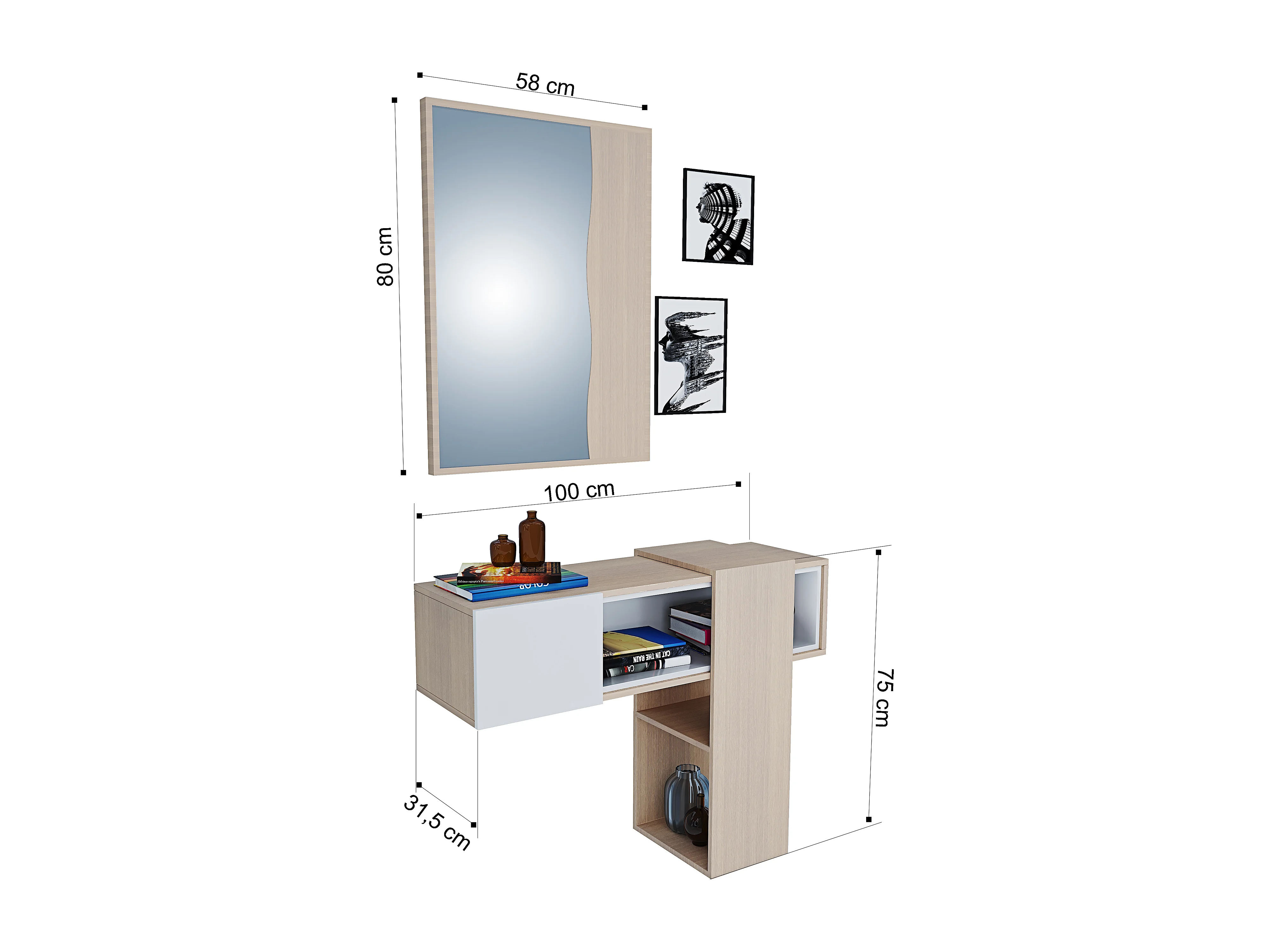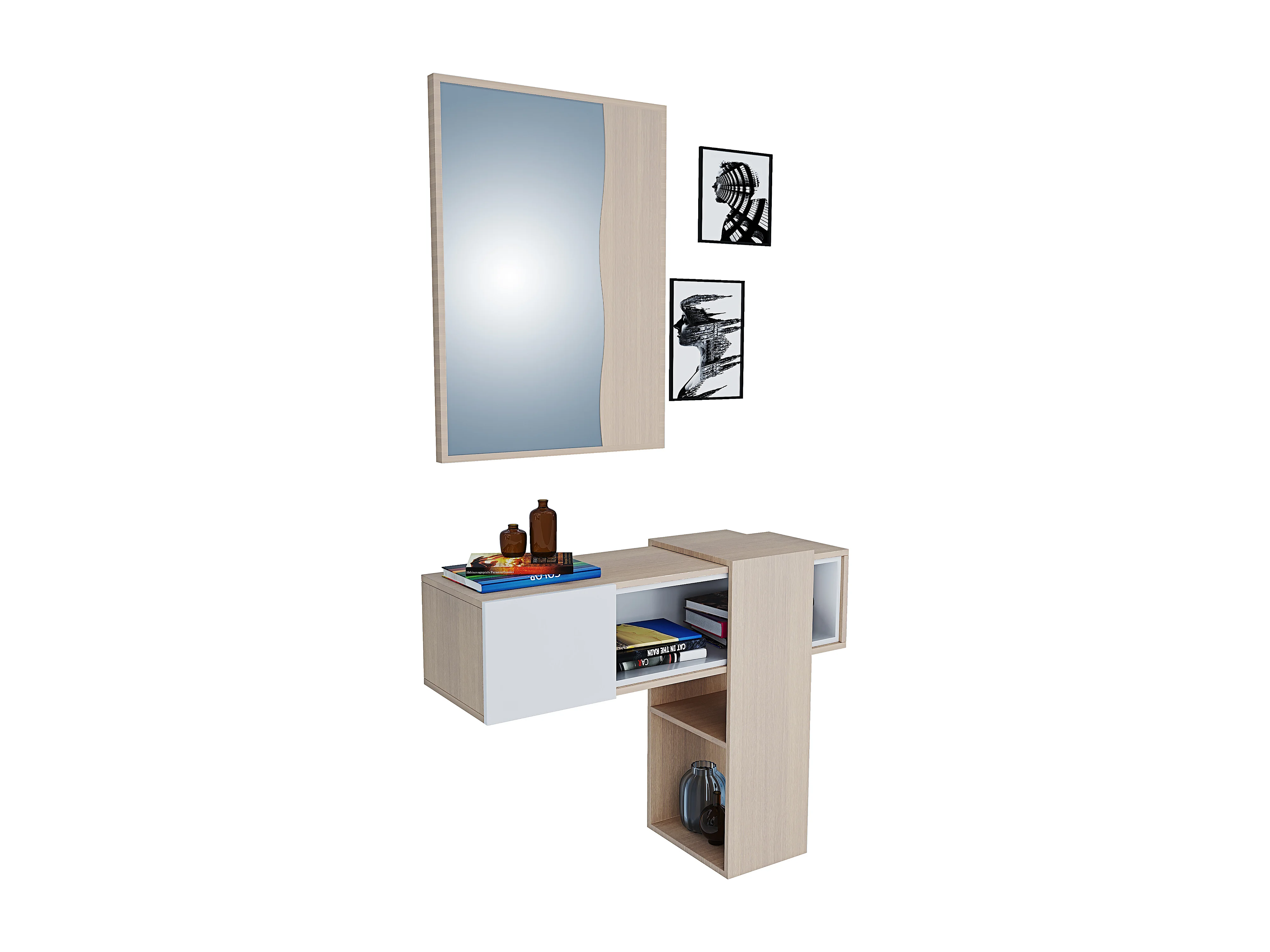 Mobile Danzica Mobiletto da Ingresso Mensola Sospesa con Specchio E Ripiani Scorrevole Arredo Arredamento Sala 100 x 31.5 x 75 cm Colore Bianco e Rovere