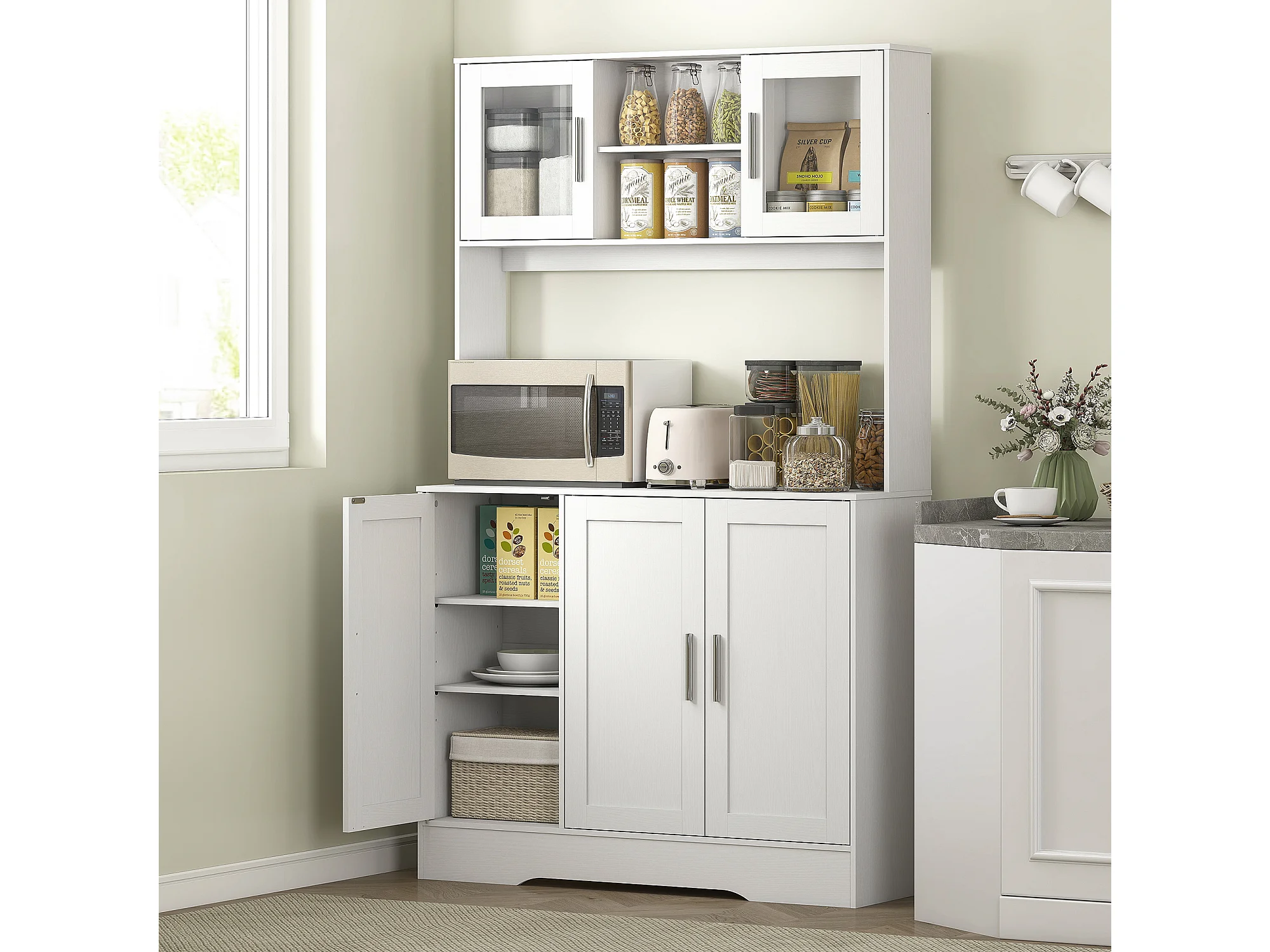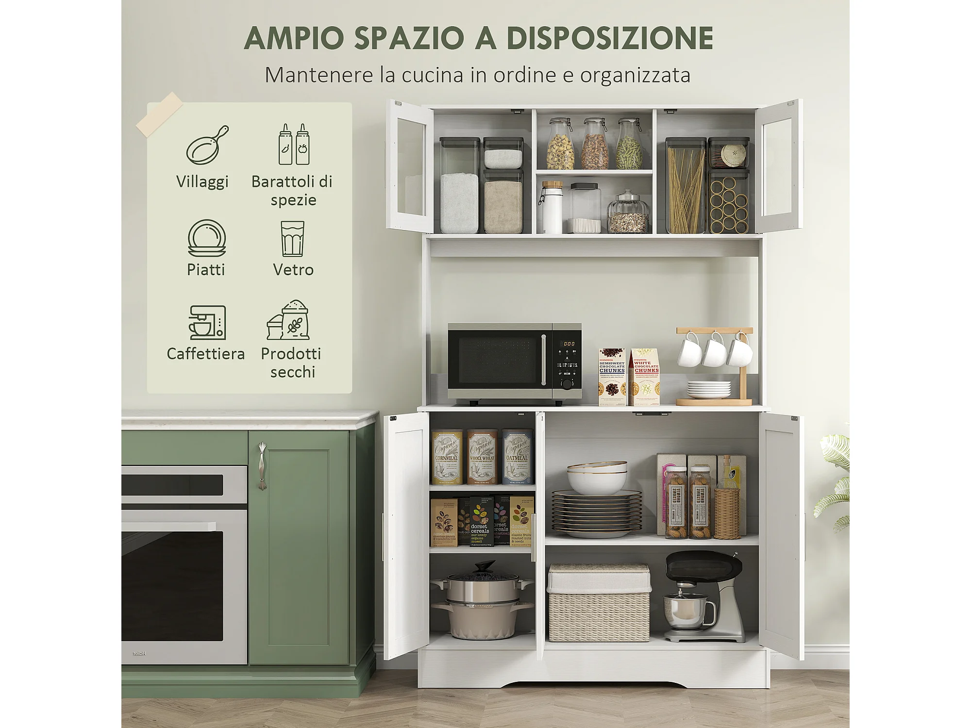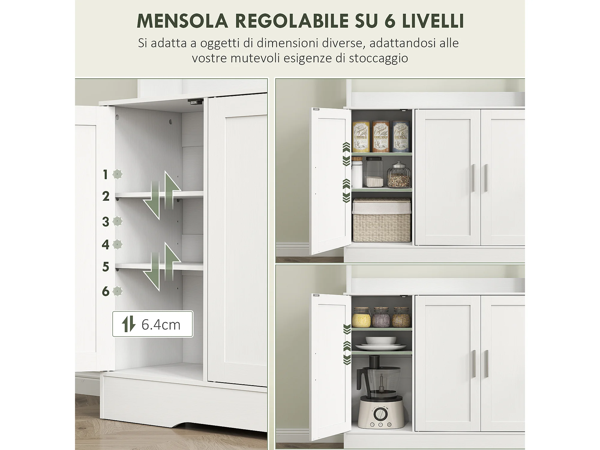 Mobile dispensa alto con 4 armadietti, 2 ripiani aperti e piano bianco