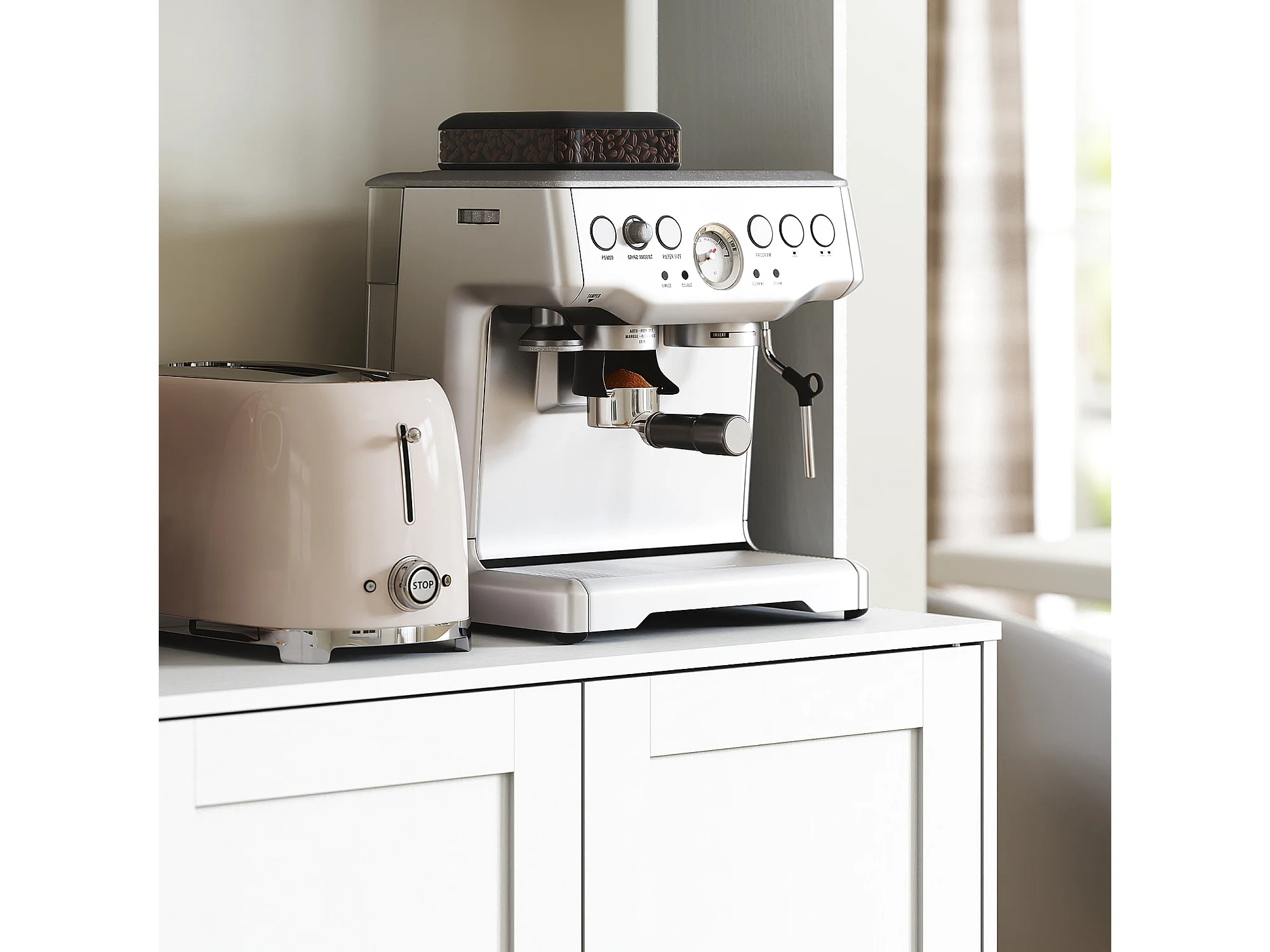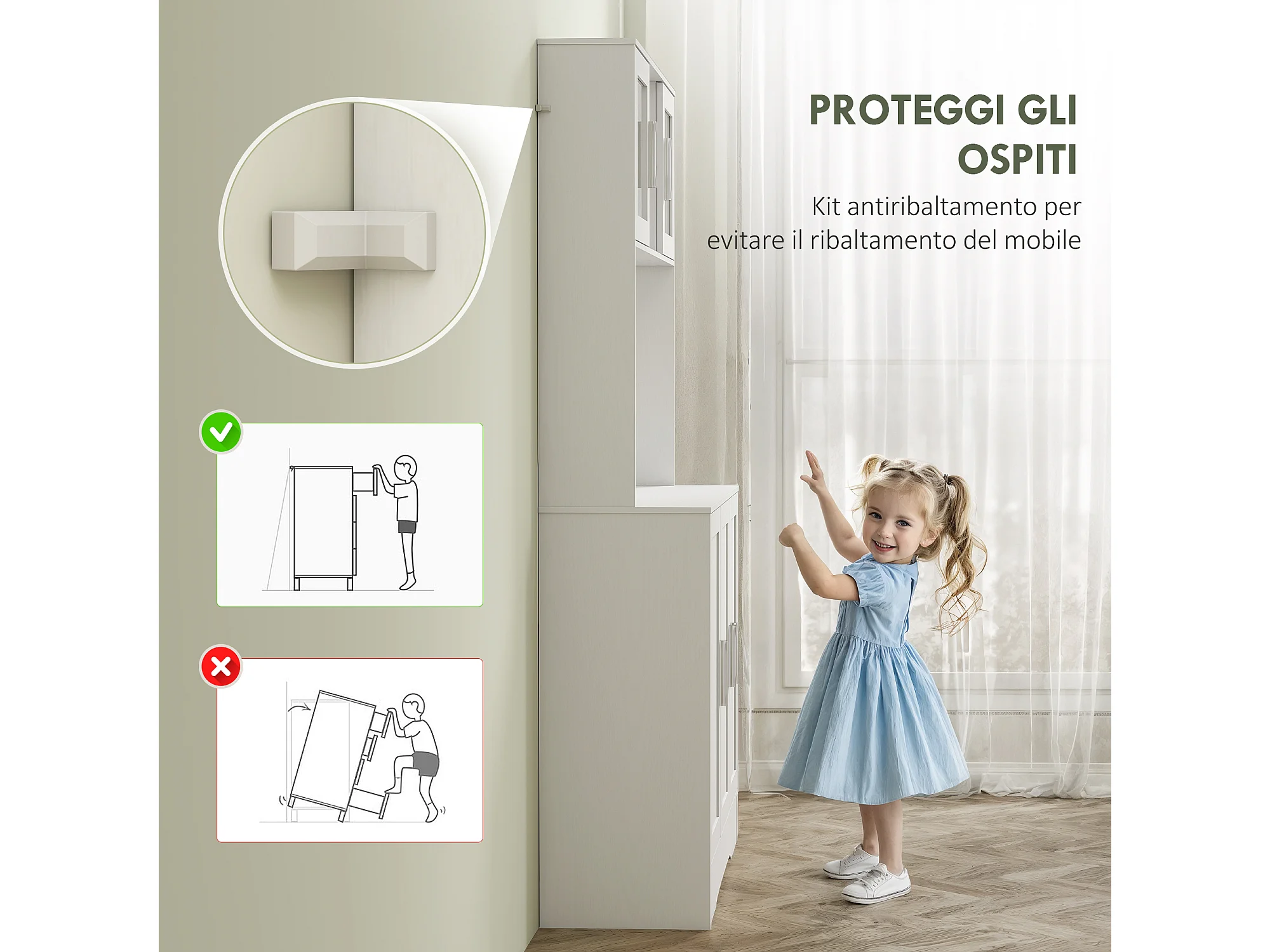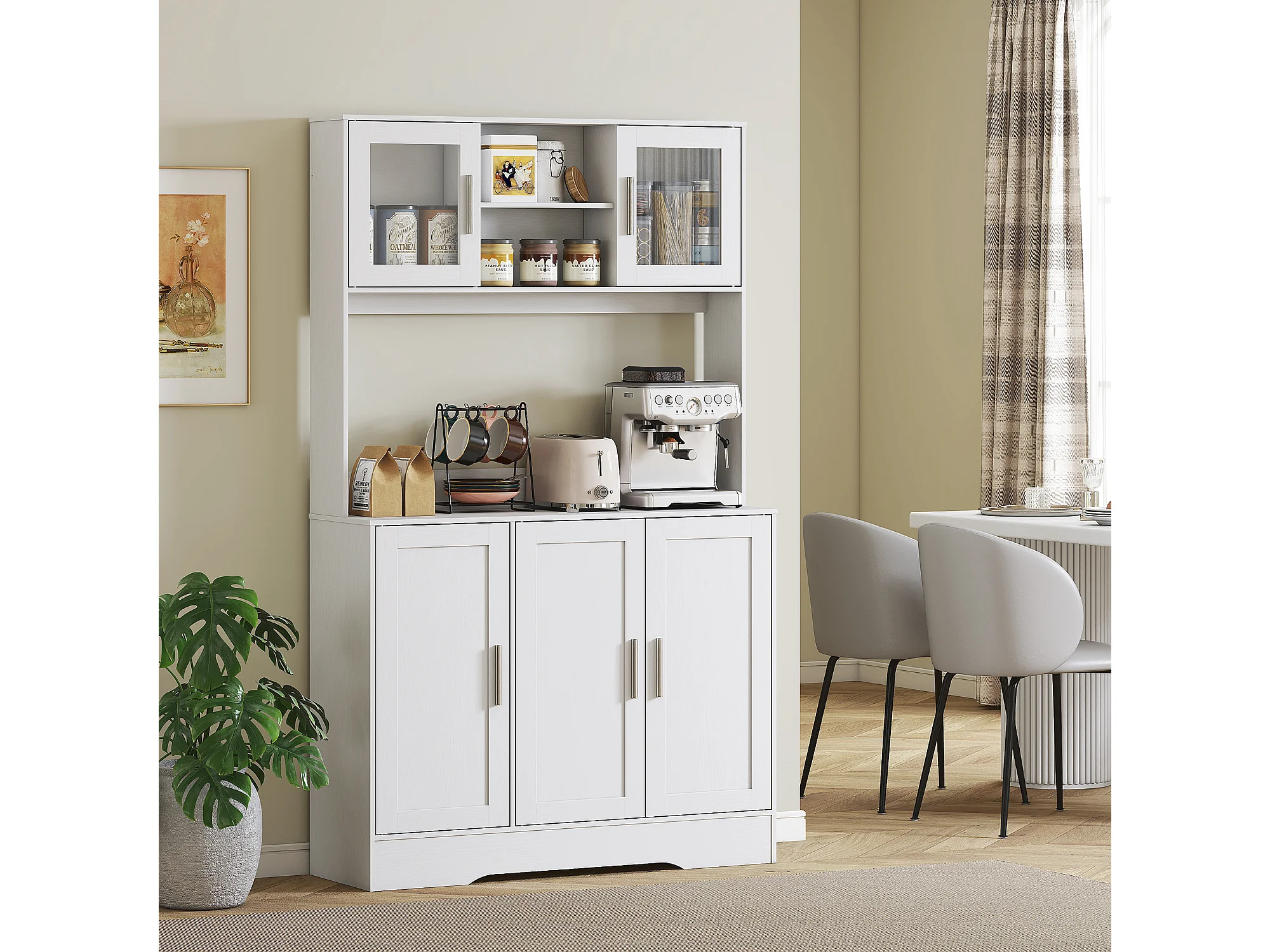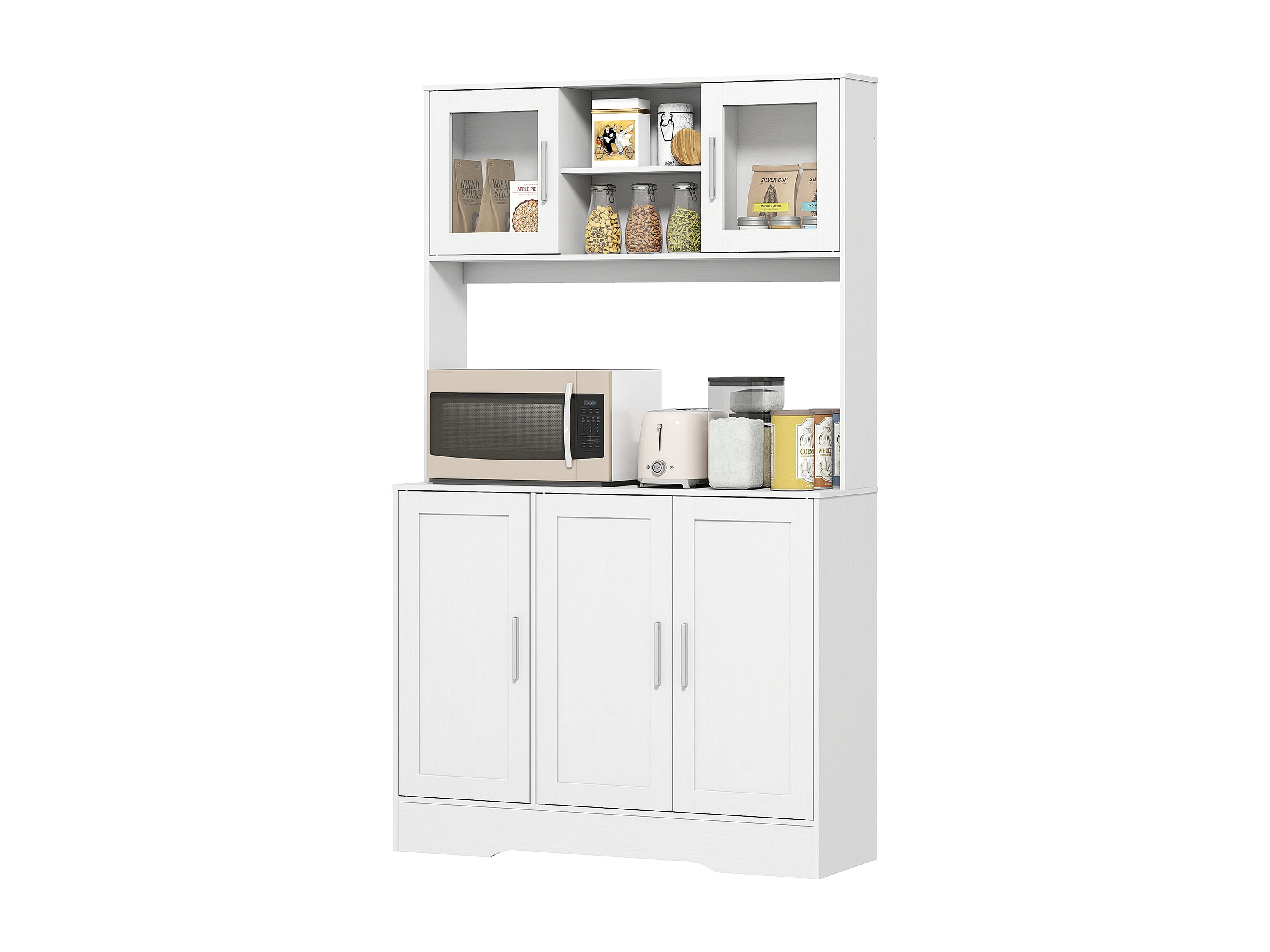 Mobile dispensa alto con 4 armadietti, 2 ripiani aperti e piano bianco