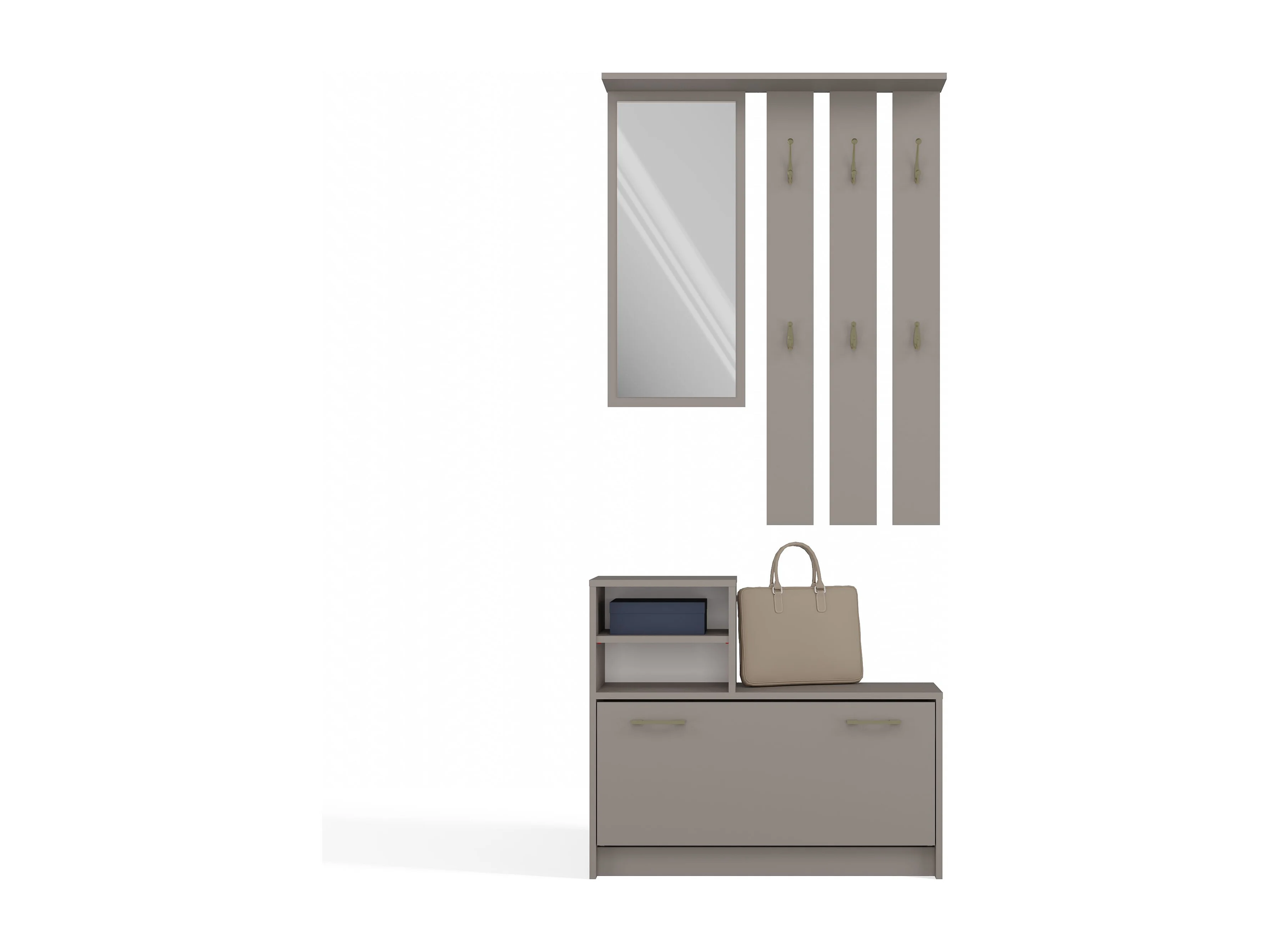 Set da corridoio Malea, set da corridoio con 1 scarpiera a muro, 1 specchio a muro e 2 pannelli appendiabiti, bianco opaco/grigio sabbia lucido