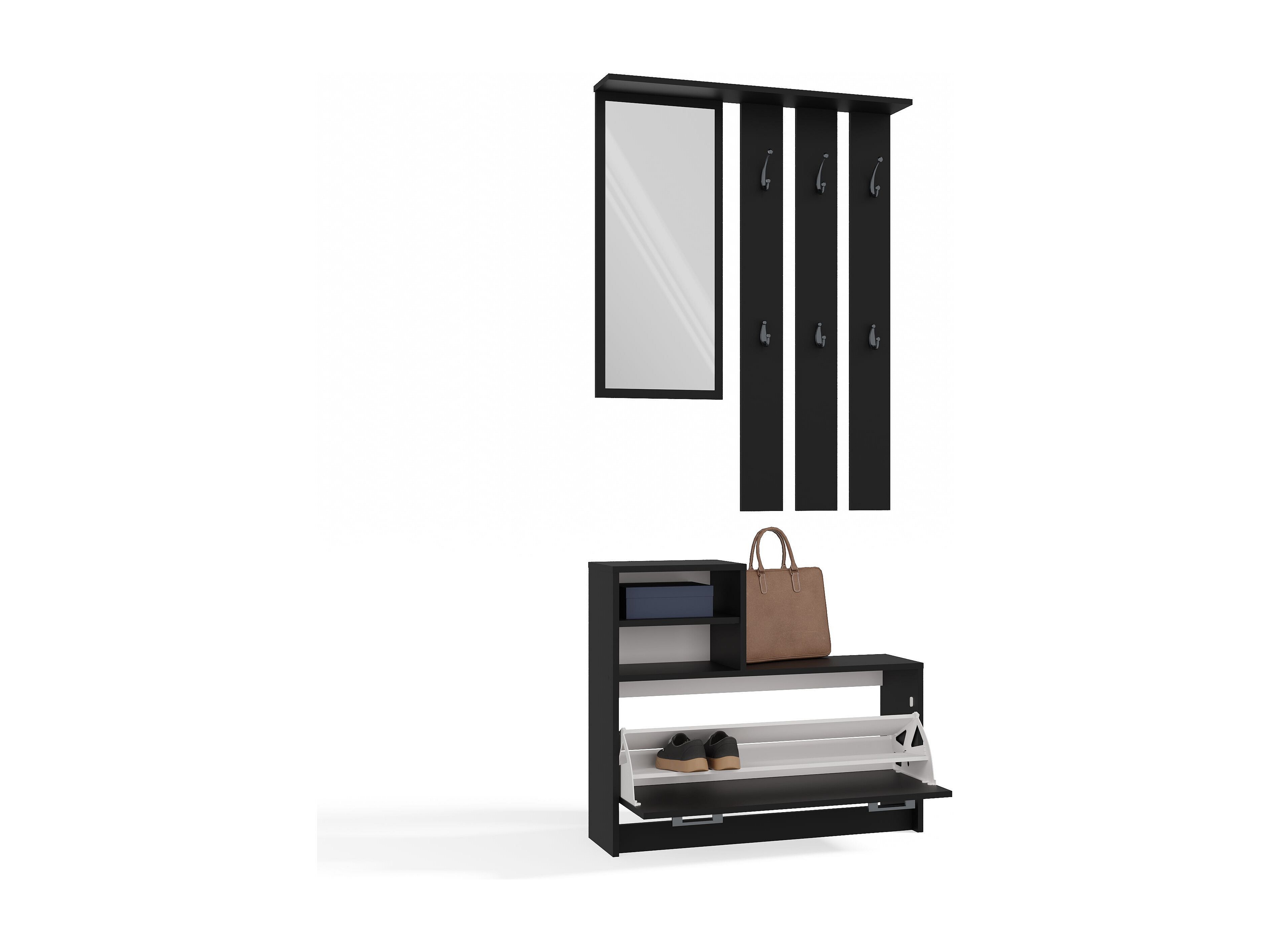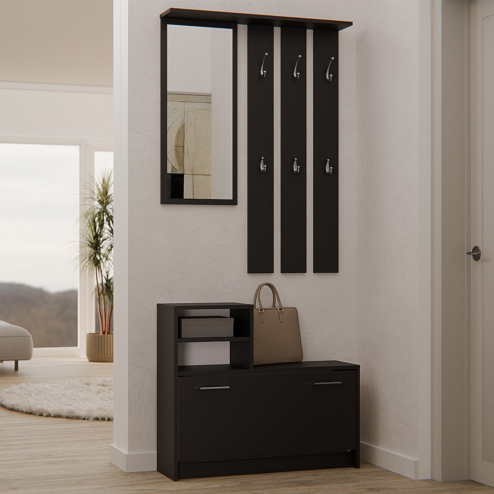 Set di mobili da ingresso con 5 ganci, specchio, scarpiera e panca, MDF, nero e naturale (100x38x191 cm)