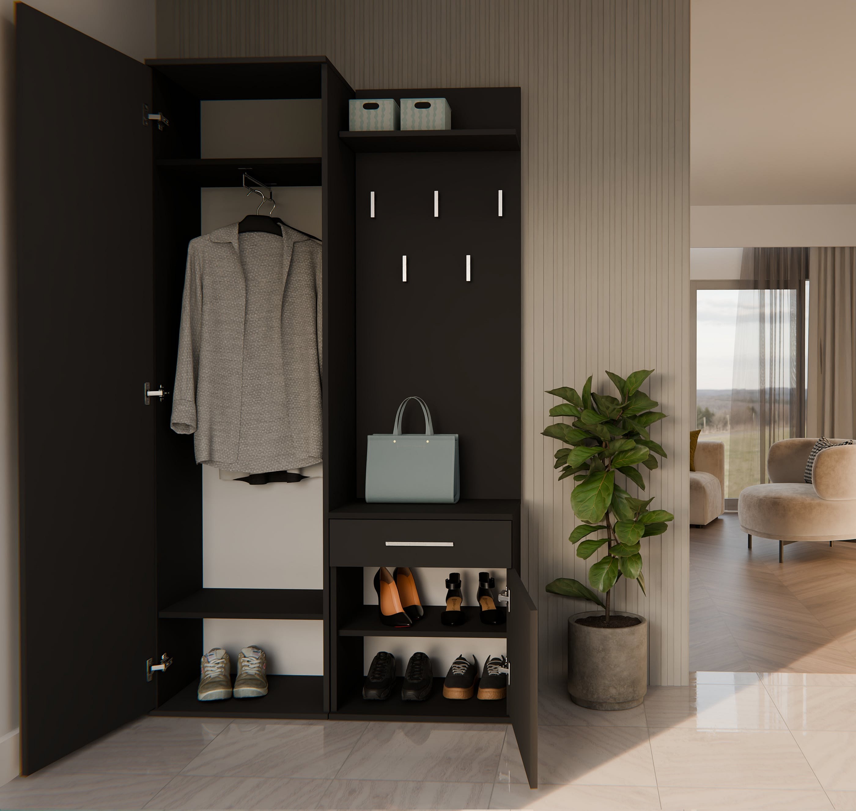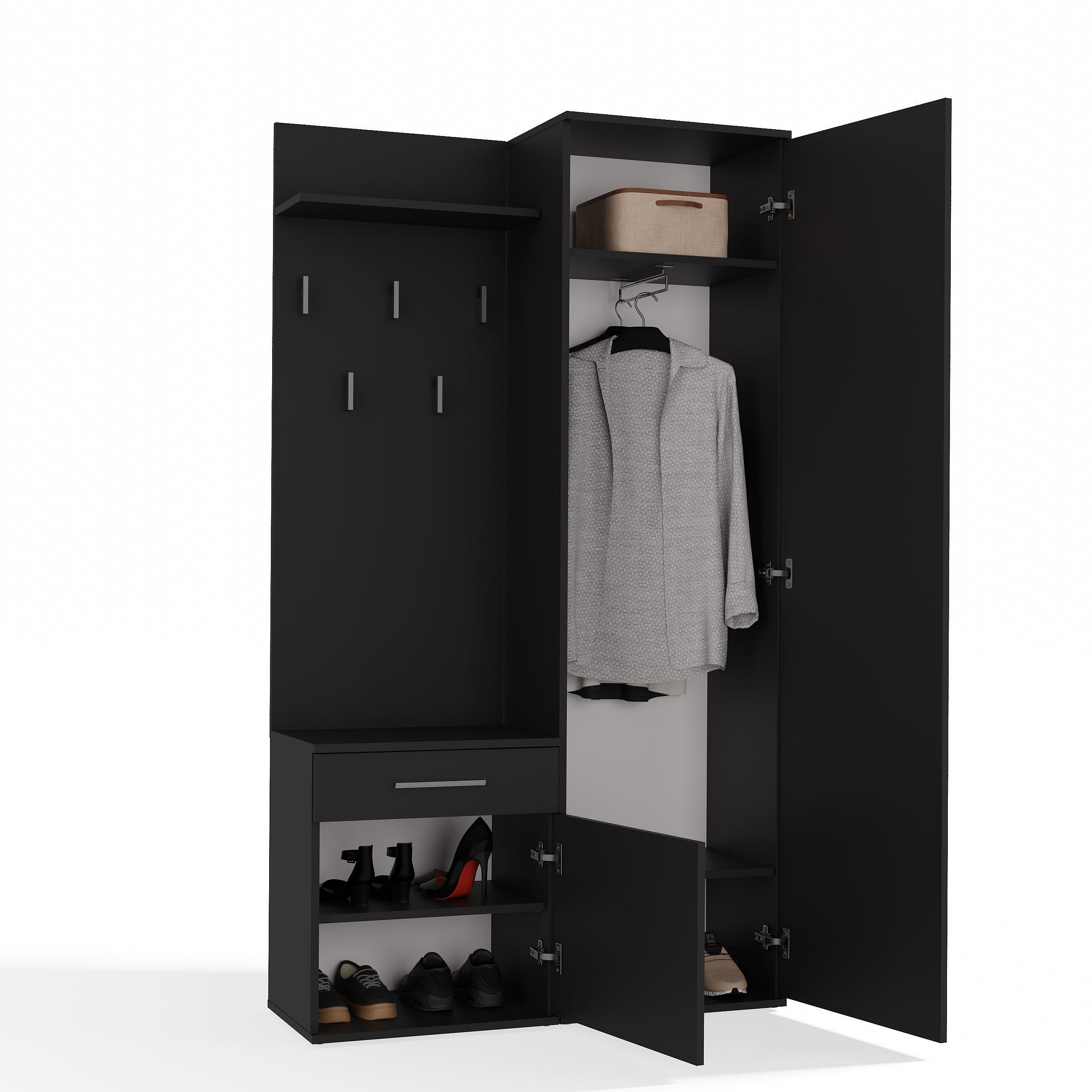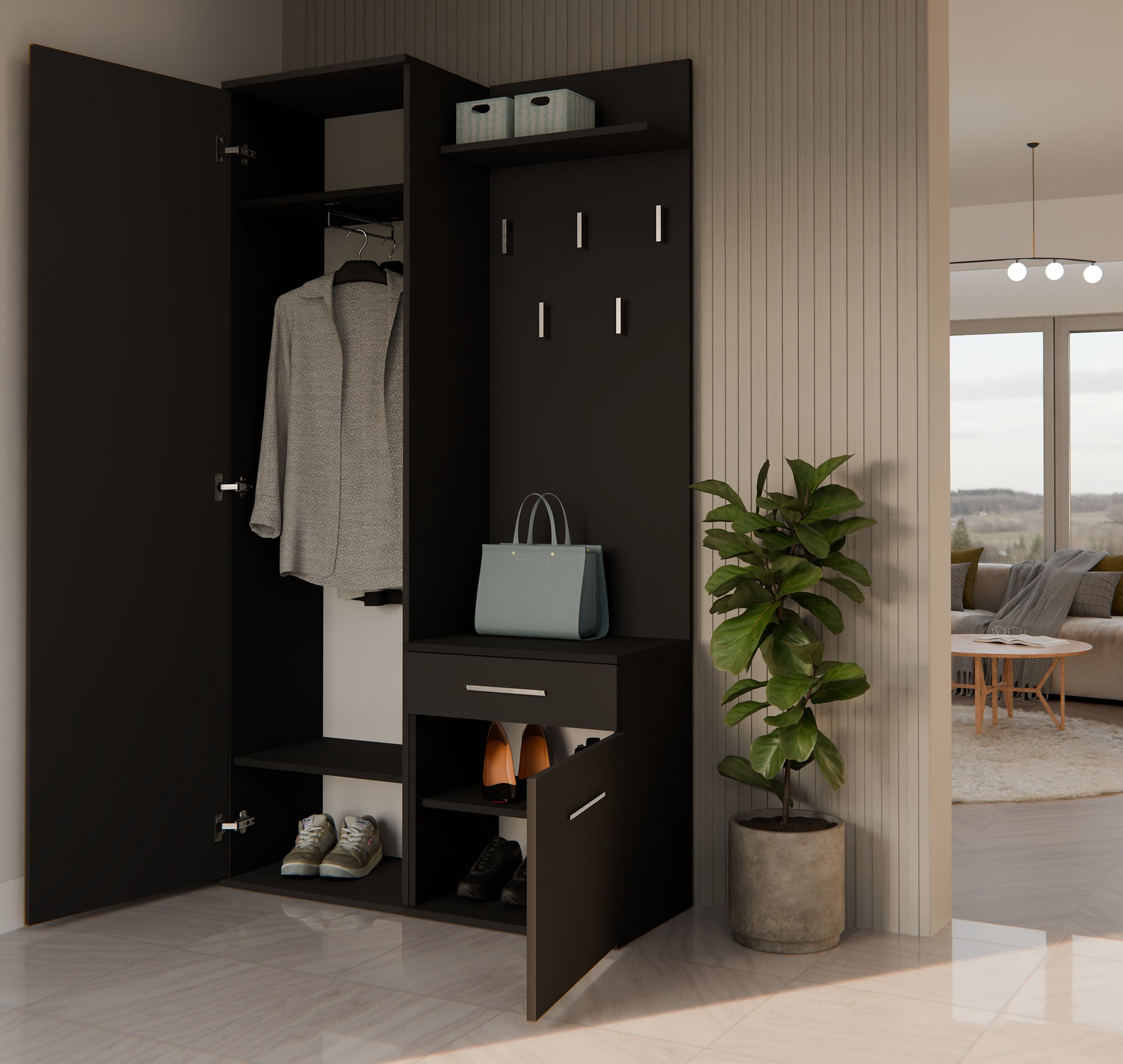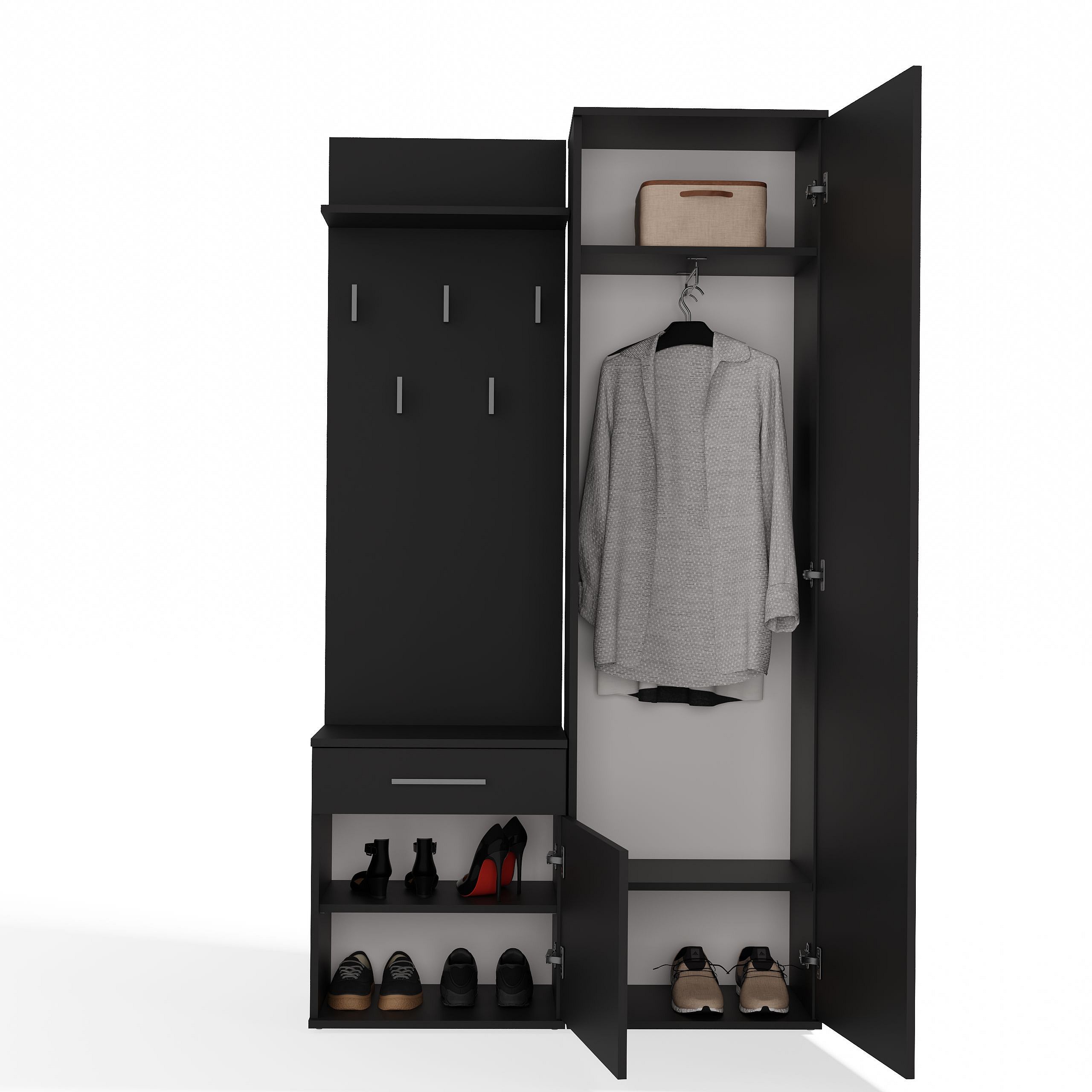 Mobile d'ingresso multifunzionale con panca, appendiabiti, ripiani, 4 ganci, 2 cassetti, 1 anta, nero, (100x35x180 cm)