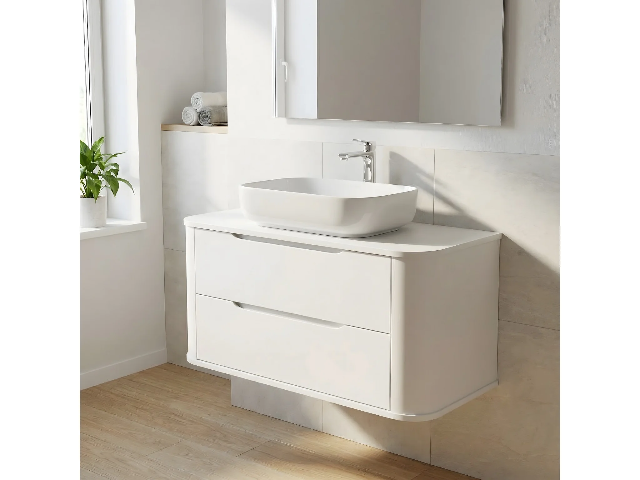 Mobile lavabo bianco con piano da 100 cm, lati arrotondati e piano
