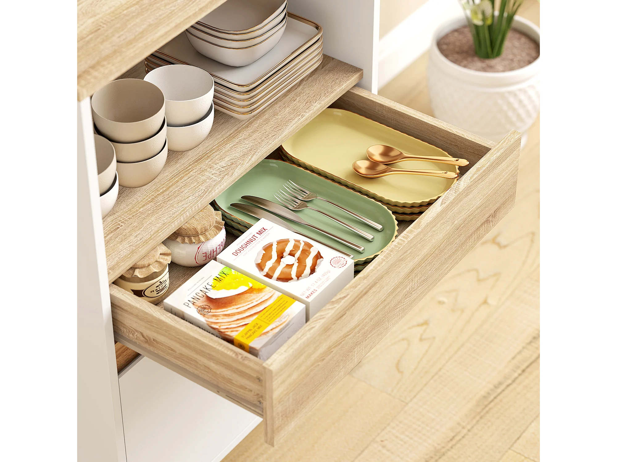 Credenza alta da cucina con 4 ante + 3 cassetti + ripiano + LED - 106 x 40 x 179,5 cm - MDF - Bianco + naturale
