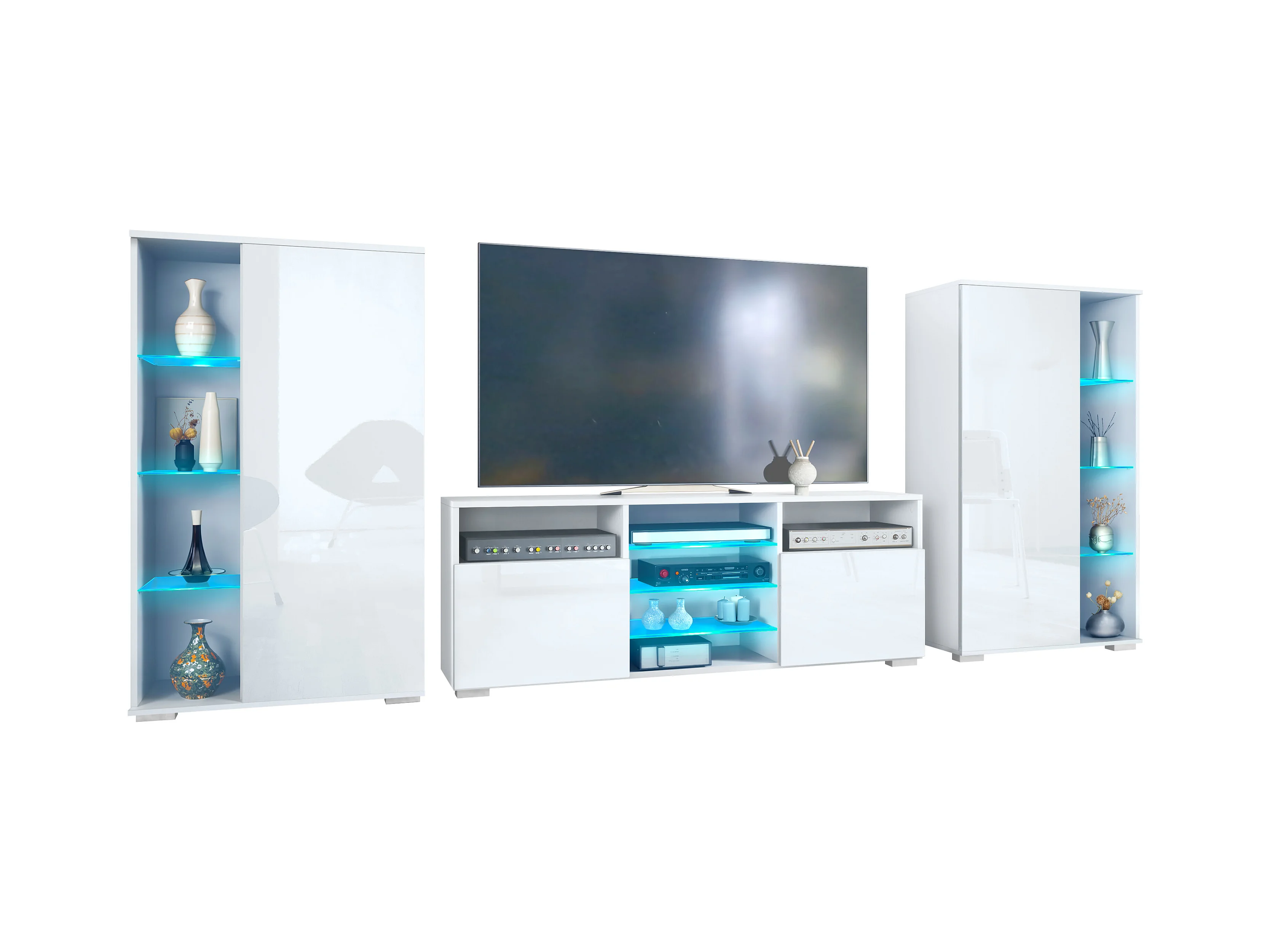 Mobile parete Davos per soggiorno, composto da 2 vetrine e 1 mobile TV, bianco opaco/bianco lucido incl. illuminazione a LED (329 x 134 x 35 cm)