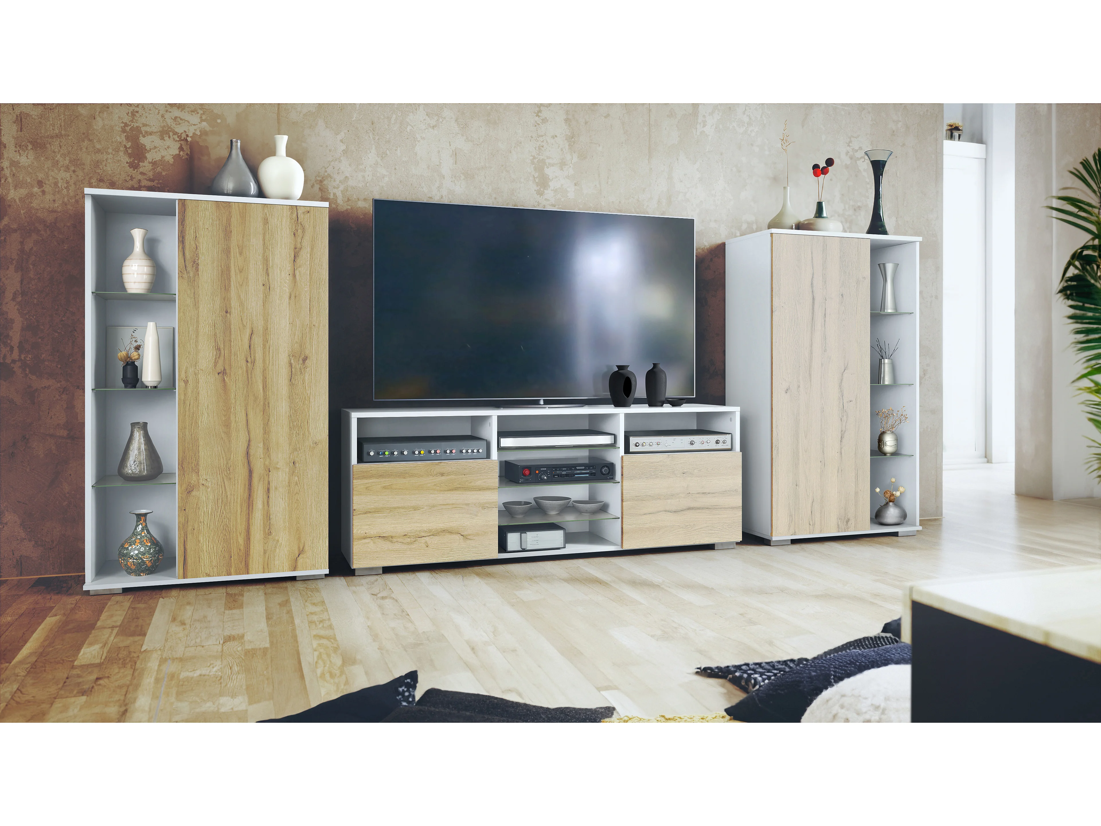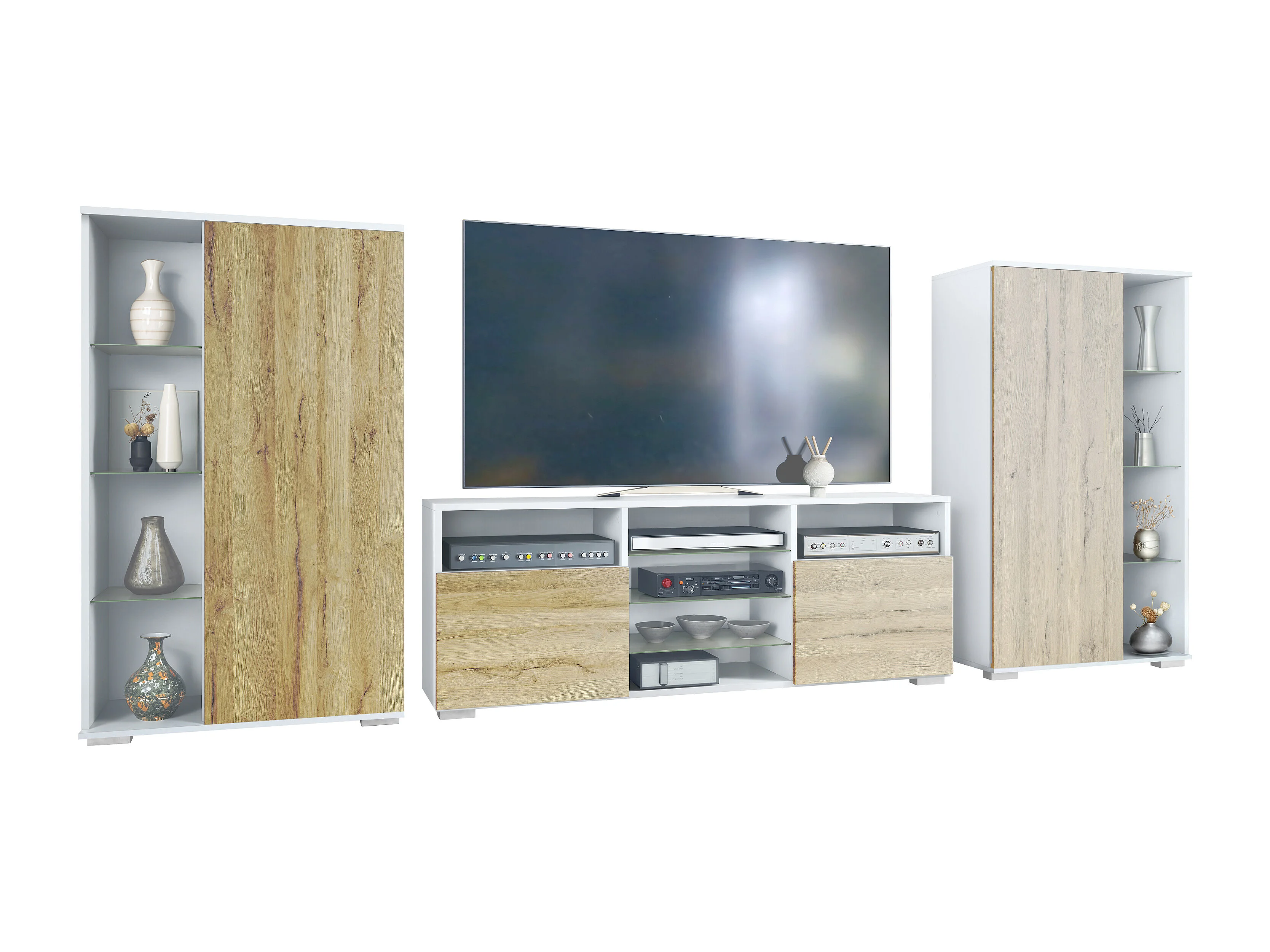 Mobile parete Davos per soggiorno, composto da 2 vetrine e 1 mobile TV, bianco opaco/rovere naturale (329 x 134 x 35 cm)