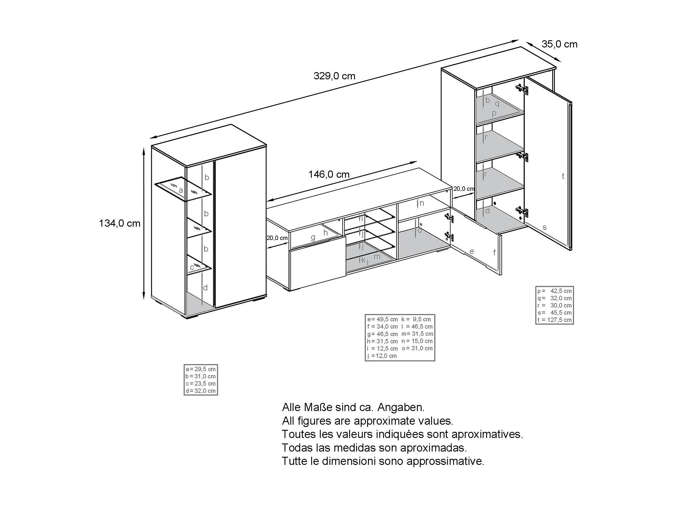Mobile parete Davos per soggiorno, composto da 2 vetrine e 1 mobile TV, antracite opaco /rovere naturale incl. illuminazione a LED (329 x 134 x 35 cm)