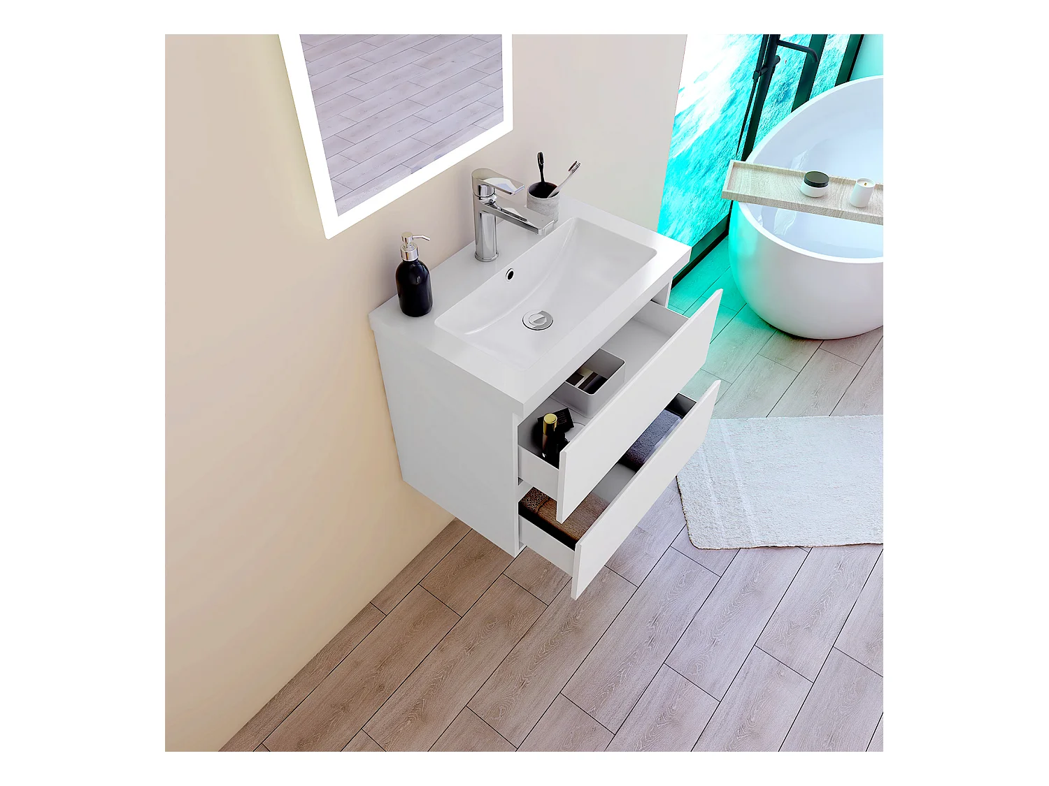 Mobile lavabo singolo sospeso - 60 x 46 x 50 cm - con LED + 2 cassetti - lavabo integrato - Ceramica + MDF - bianco (Rubinetto non incluso)