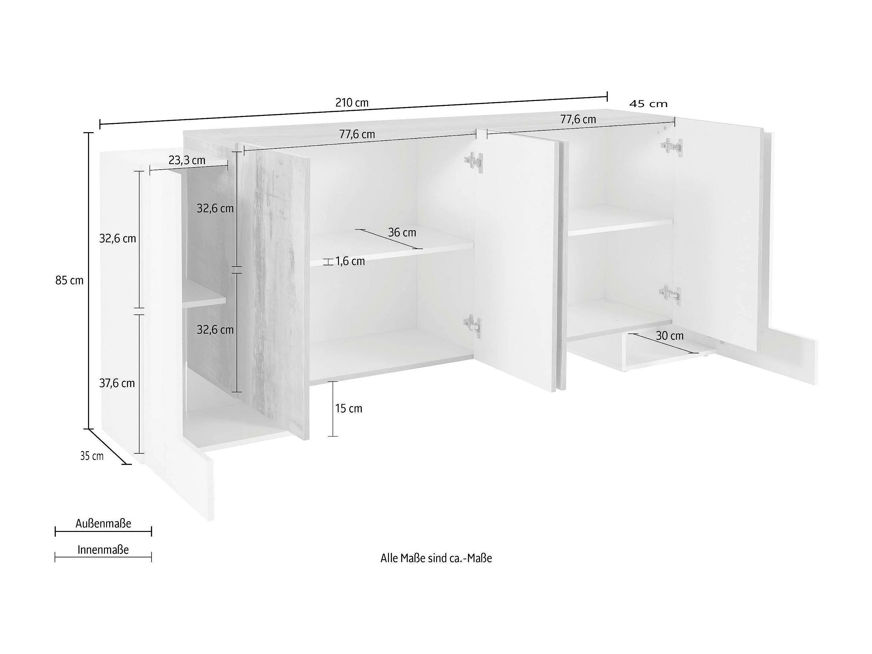 Credenza Fresia, Mobile buffet a 3 ante e 1 ripiano regolabile, Madia elegante da soggiorno, Mobile porta TV, 100% Made in Italy, 184x45h77 cm, Bianco e Cemento