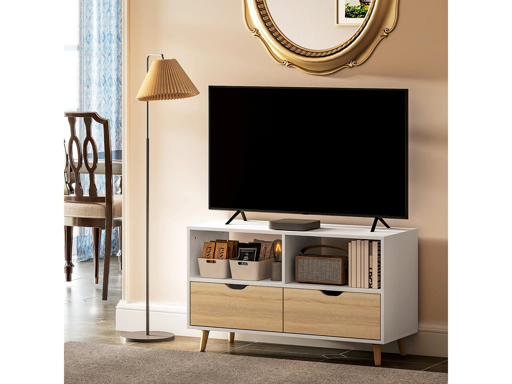 Mobile porta TV bianco da 99 cm con cassetto e 2 ripiani, moderno mobile porta TV per soggiorno