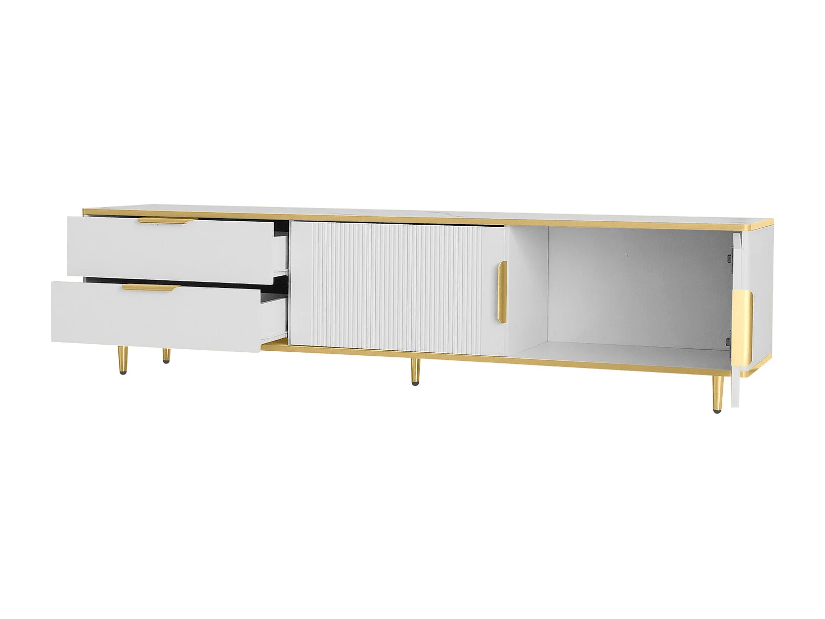 Mobile porta TV con contenitore, 2 ante e 2 cassetti, mobile porta TV basso, gambe e maniglie dorate, bianco