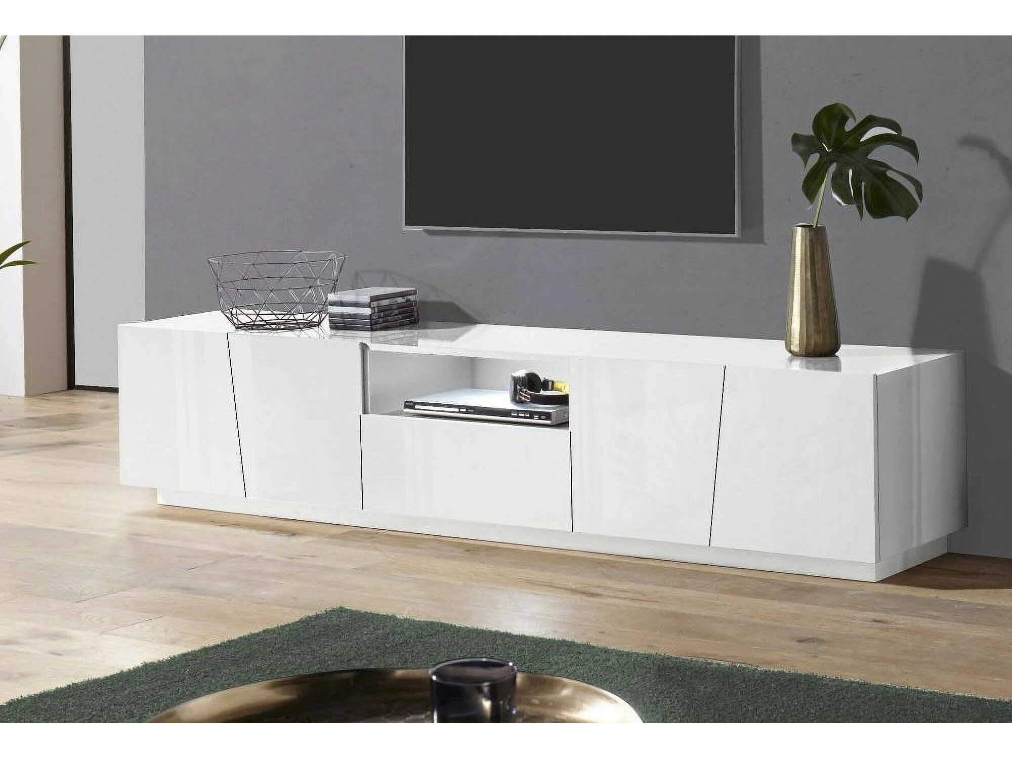 Mobile porta TV Paul, Credenza bassa da soggiorno, Base porta televisione, 100% Made in Italy, cm 220x43h46, Bianco lucido