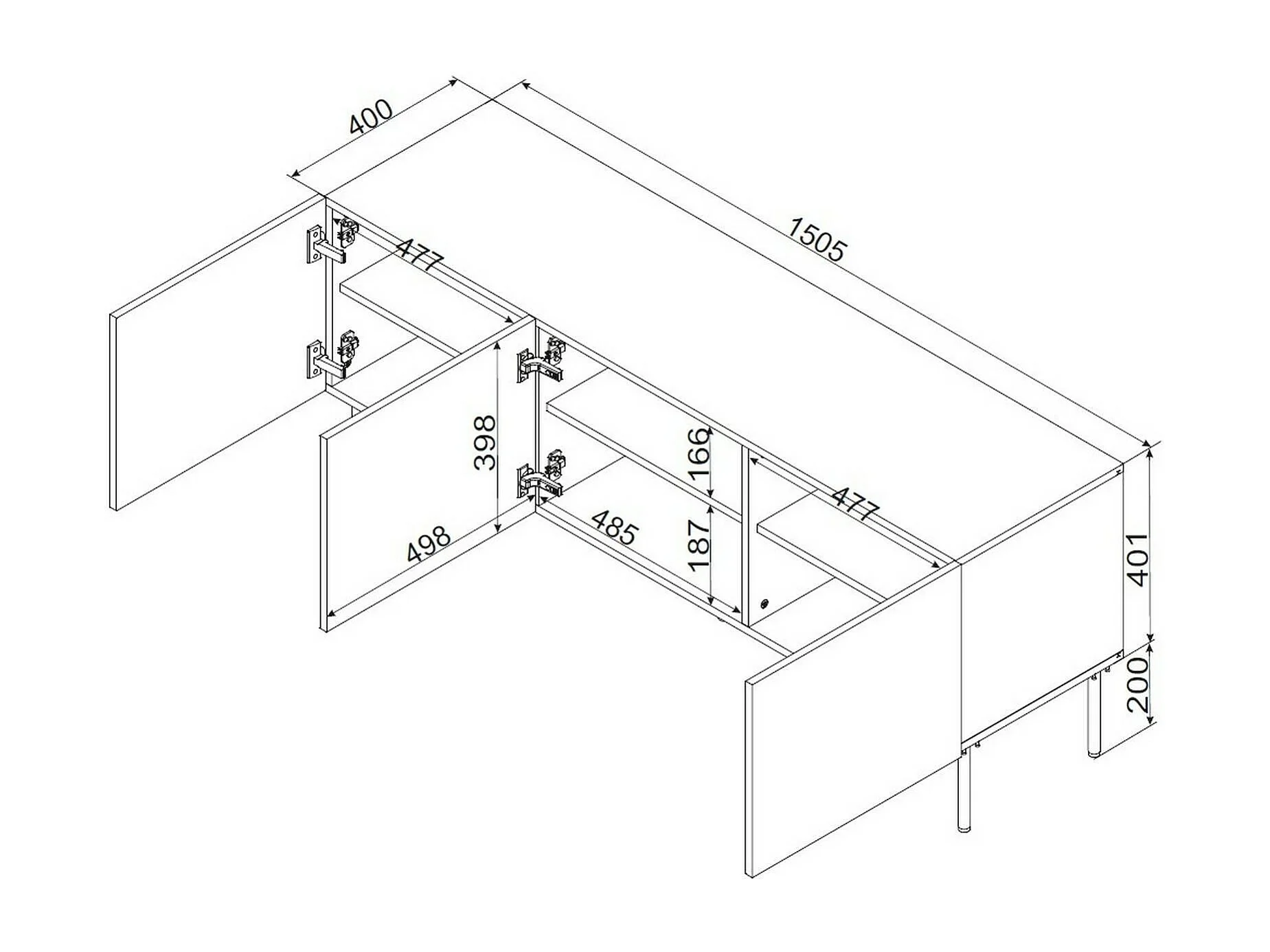 Mobile porta TV Sospiro, Madia da salotto con quattro ante battenti e quattro vani interni, Rialzato da terra, 201x42 h60 cm, Nero