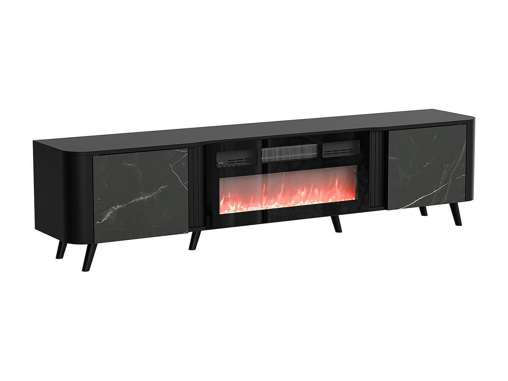 Mobile porta TV Vicino, Madia da salotto con due ante battenti e camino elettrico, Rialzato da terra, 191x40 h58 cm, Marmo e Nero