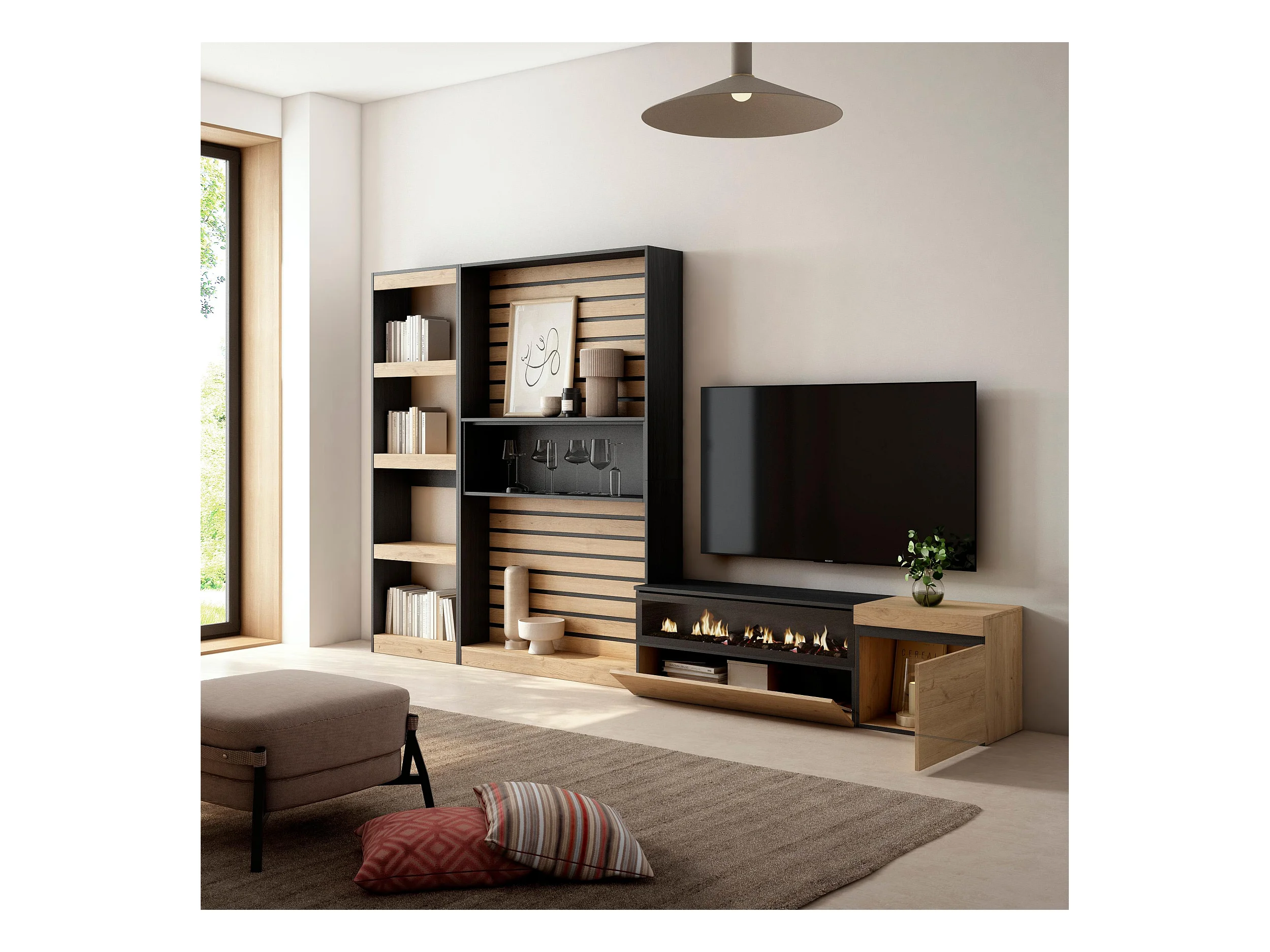 Mobile Soggiorno TV, 320x35x186cm, Camino elettrico, Rovere e nero