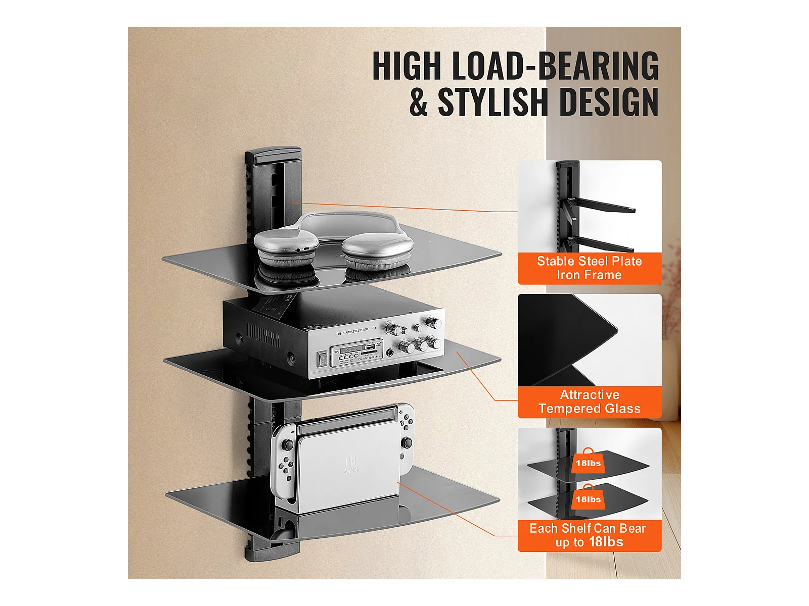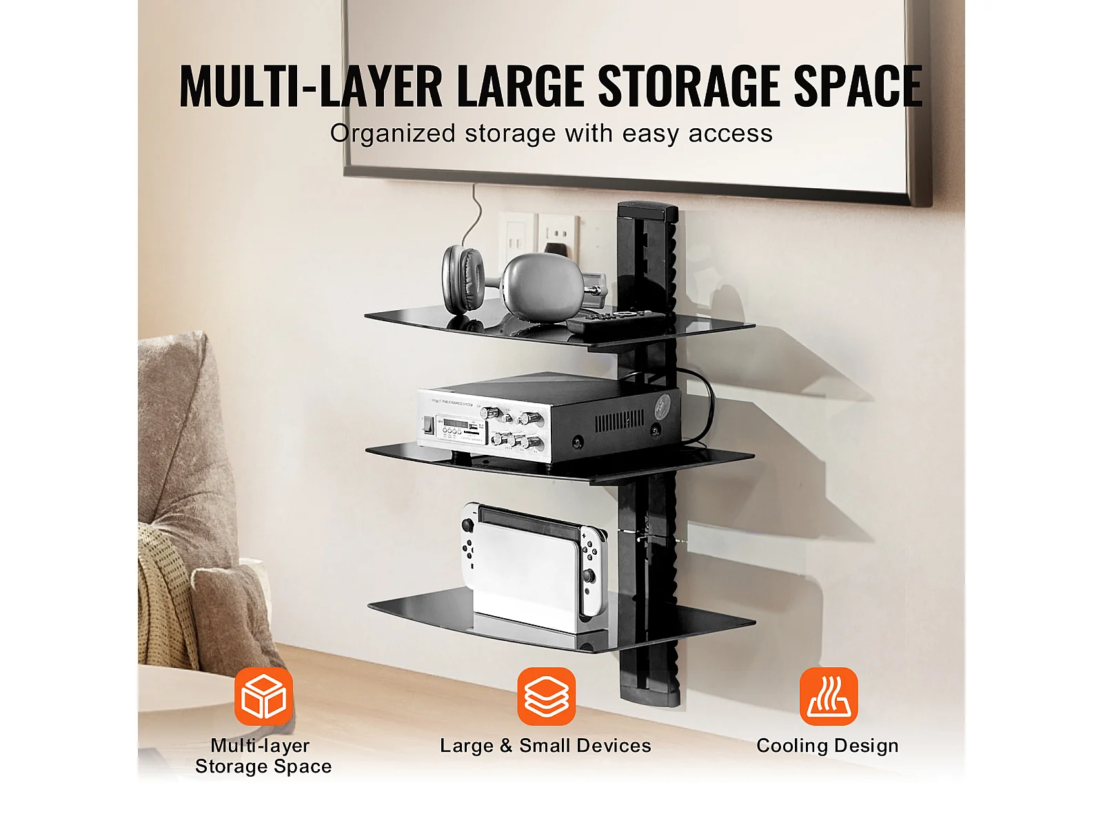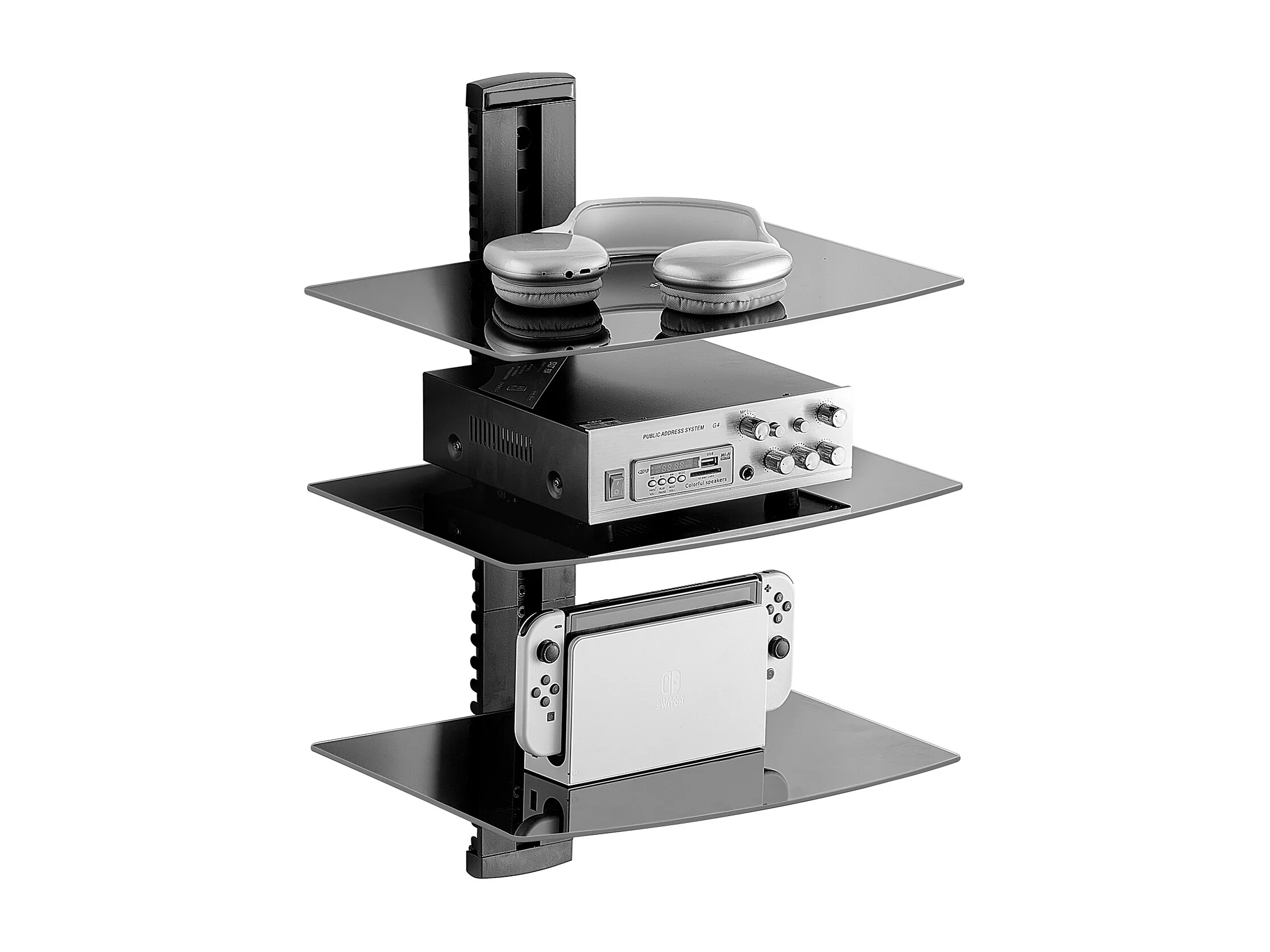 Mobile SucceBuy Pianchette a Sospensione in Vetro a 3 Livelli , Supporto Murale per Televisore, Sopporta 8KG, Nero