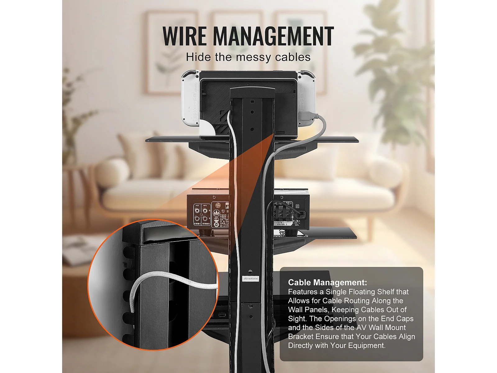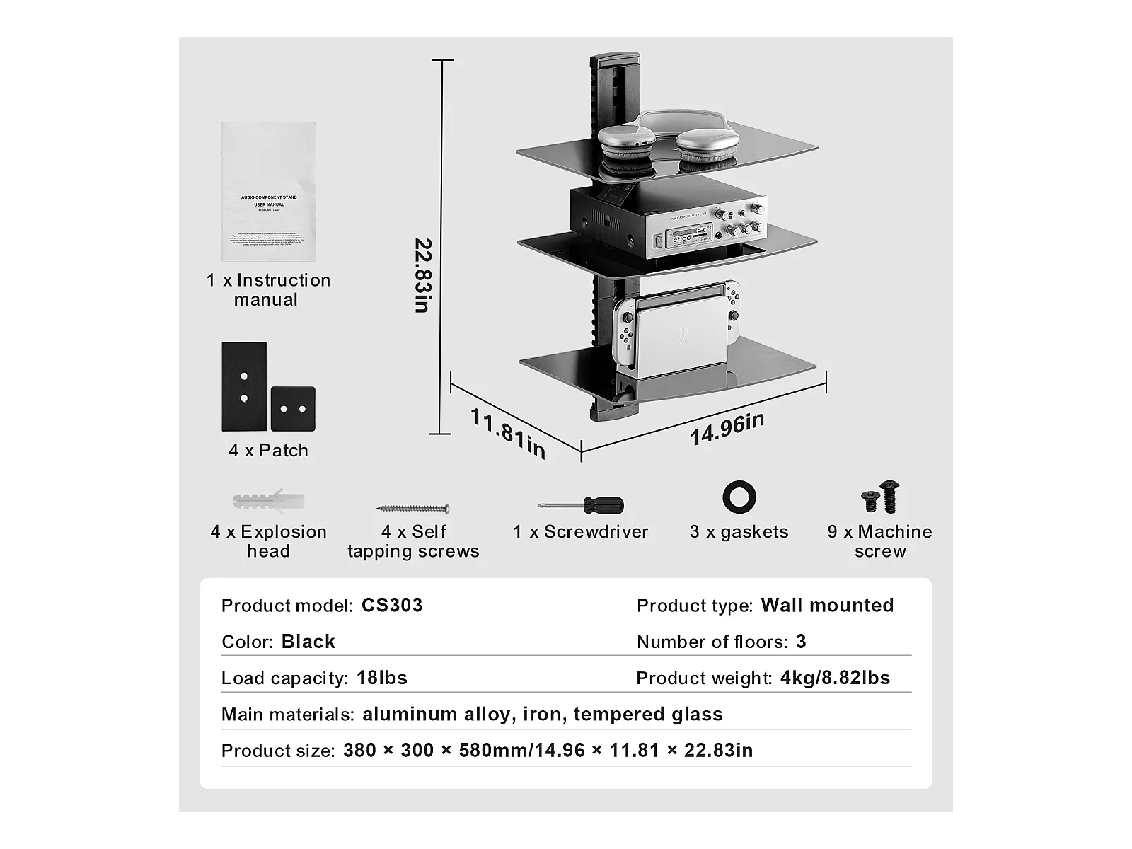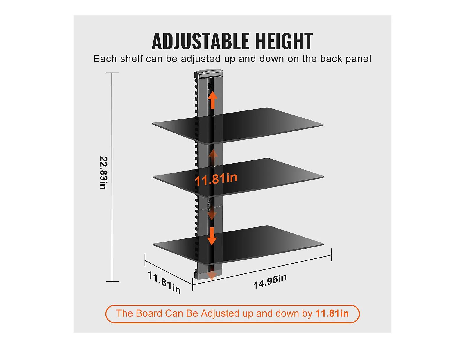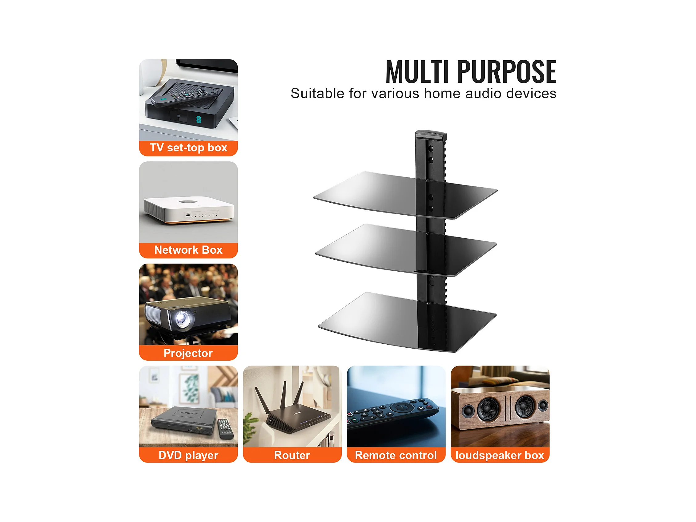 Mobile SucceBuy Pianchette a Sospensione in Vetro a 3 Livelli , Supporto Murale per Televisore, Sopporta 8KG, Nero