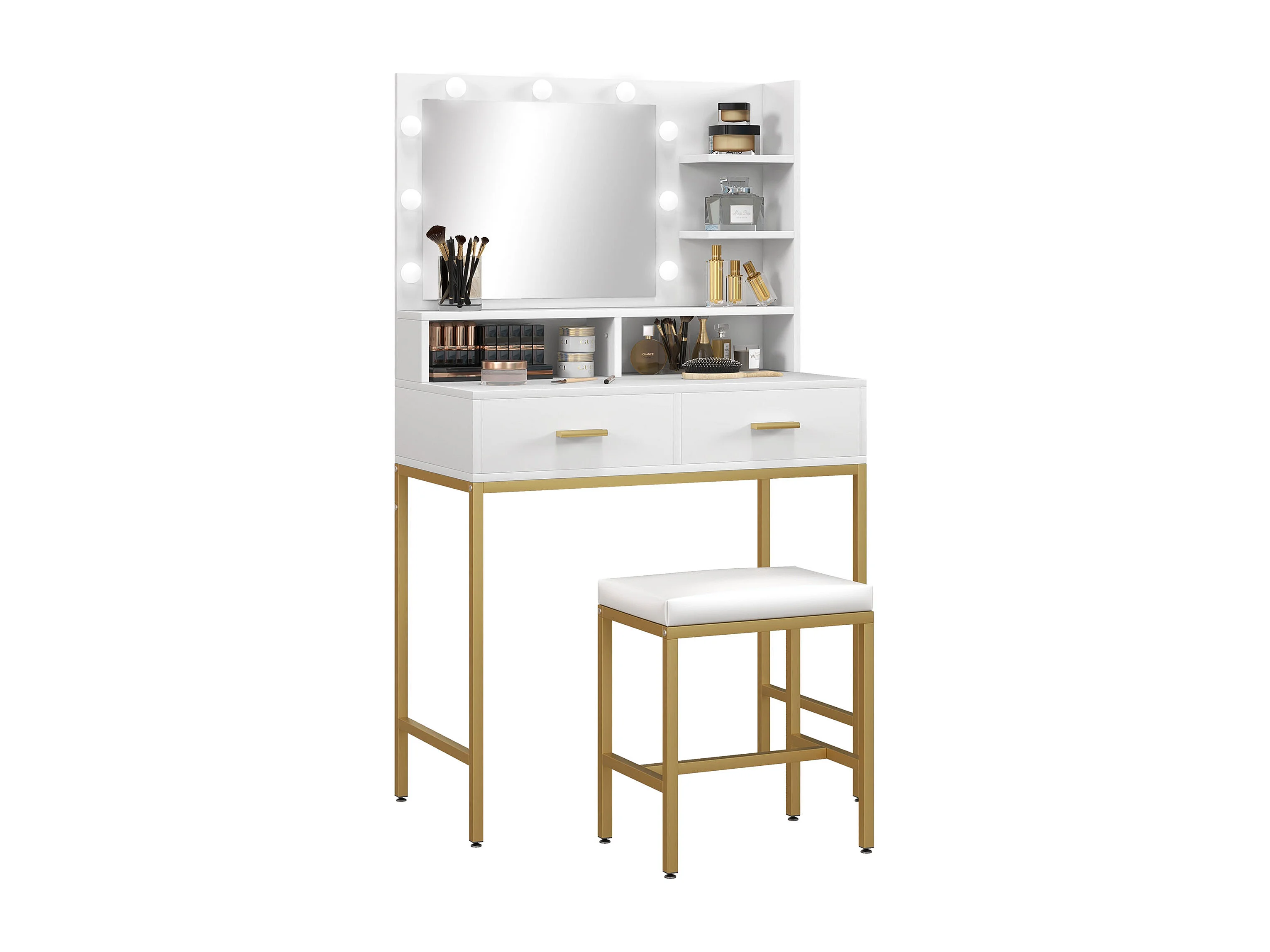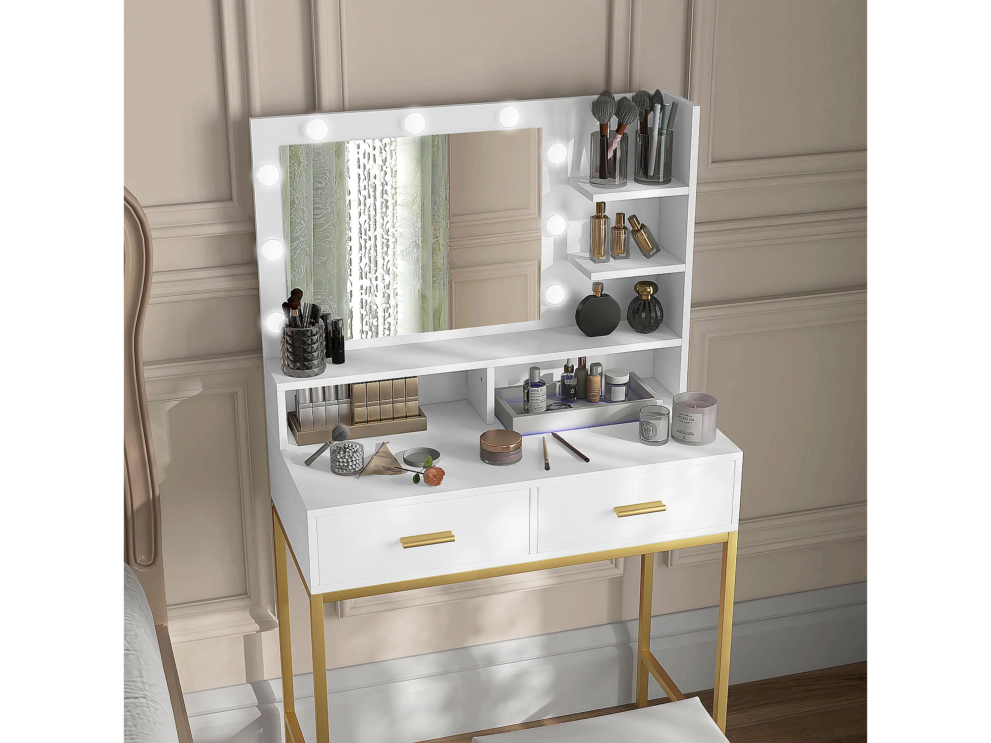 Tavolo da trucco in mdf con specchio, 2 cassetti e sgabello bianco