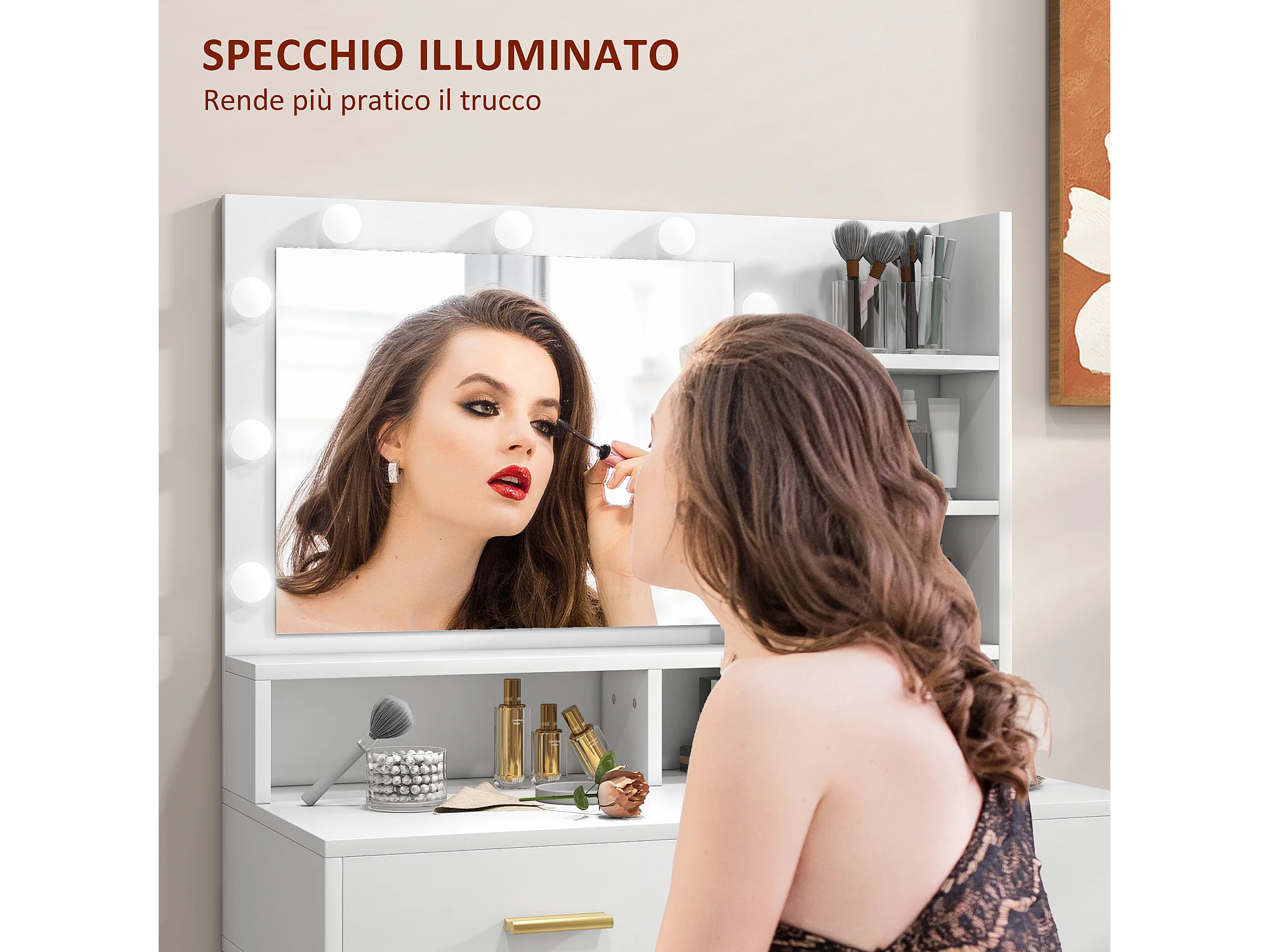 Set toeletta con sgabello e specchio illuminato cassetti e ripiani