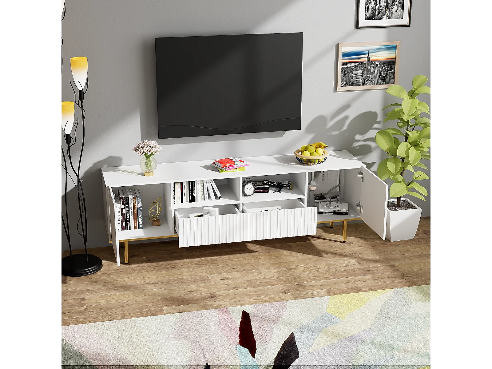 Mobile TV 165x36x55cm, con 2 ante, 2 cassetti e 2 scomparti, piedini dorati e bordo dorato, Bianco
