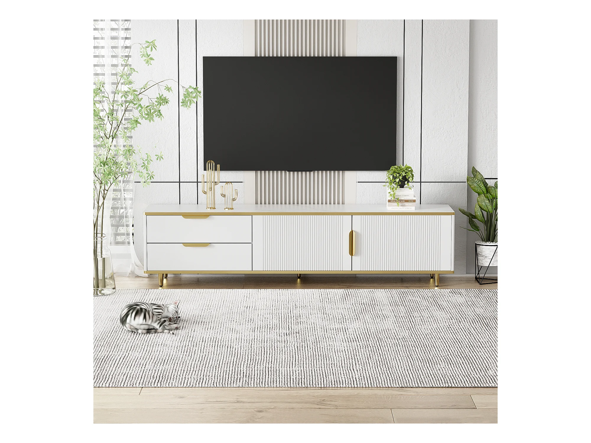 Mobile TV 175 cm MDF bianco con porte e tiroirs pieds dorés rangement salon moderne
