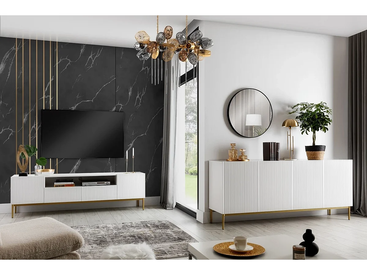 Mobile tv 2 ante e 2 cassetti bianco con piede metallo oro 200x45 cm