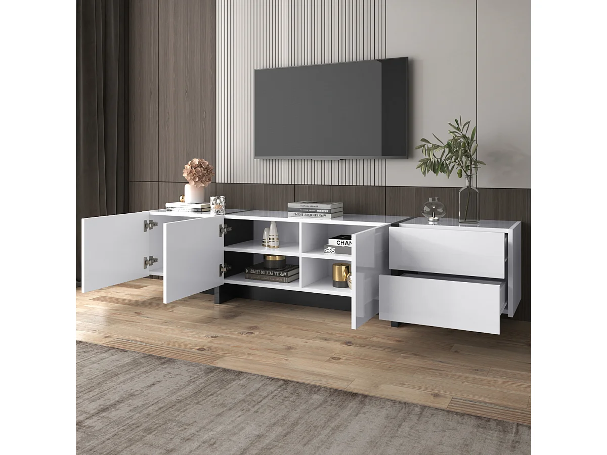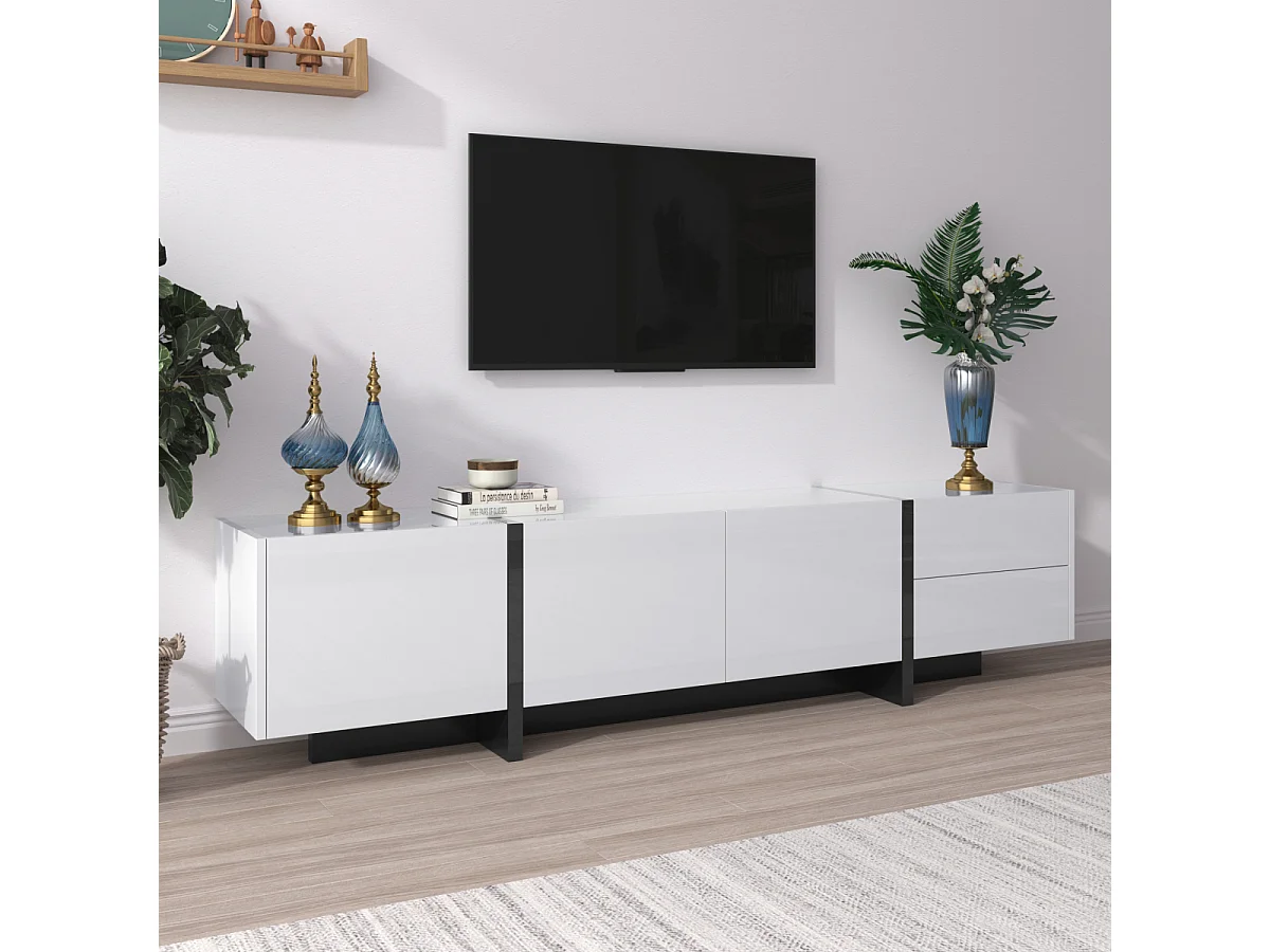 Mobile TV bianco e nero lucido con ante e cassetti. Design semplice e lineare.